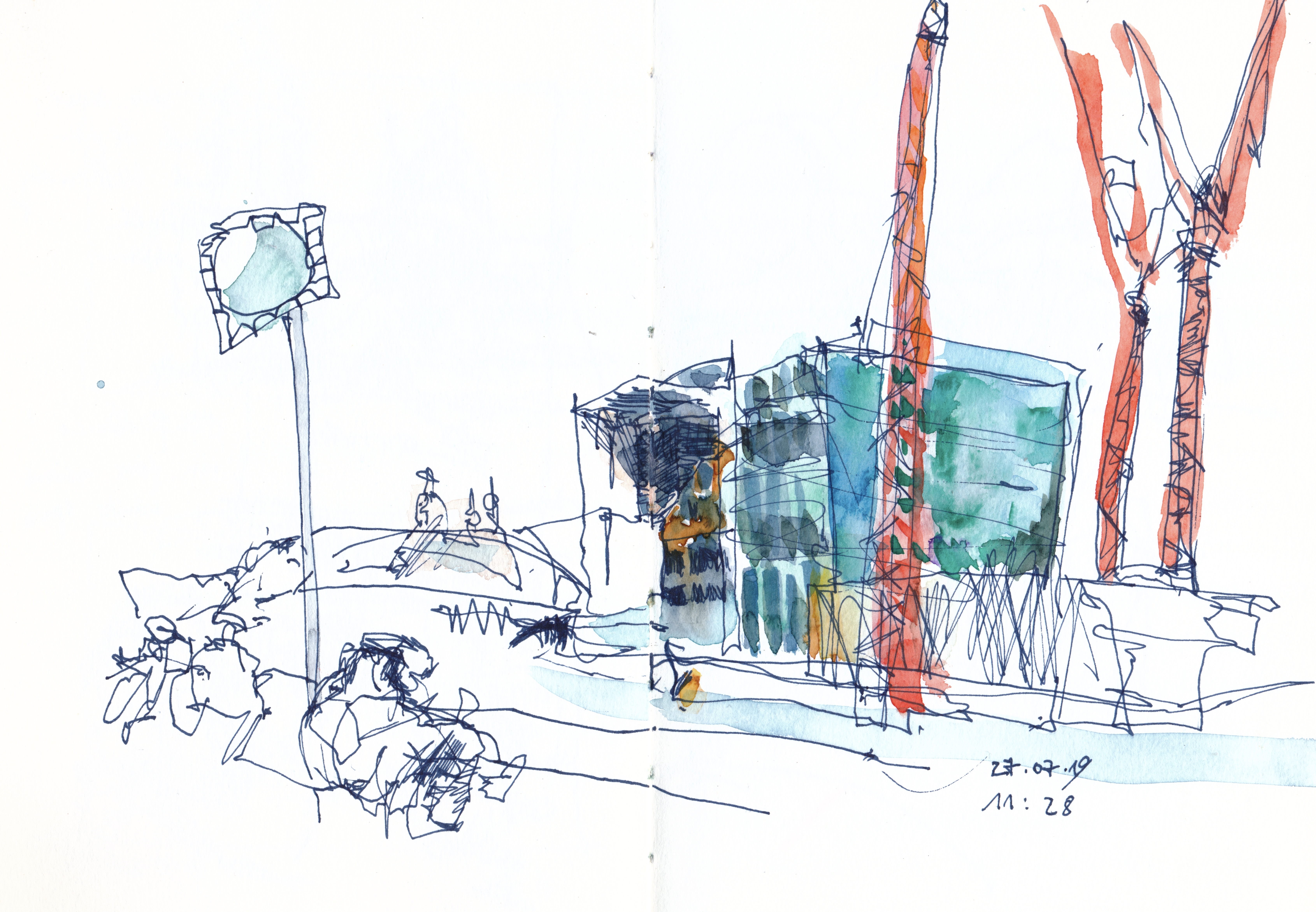 Ich habe das Bild ganz ohne Vorzeichnung mit dem Pinsel angelegt und die sparsamen Tintenstriche in rot und grün zu Hause ergänzt, dabei auch die Farbtöne noch einmal etwas vertieft. Mein dezeitiges Skizzenbuch ist ein Stillman&Birn Zeta mit glattem, kräftigem, wunderbar plan liegendem Papier, das sich mit Übergängen und Verläufen schwerer tut als mit feinen Linien.