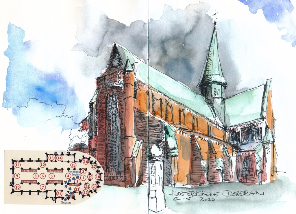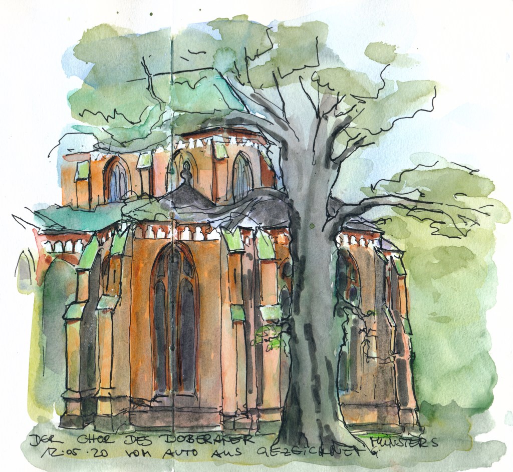 Veröffentlicht: 3. Juni 2020 Abgelegt unter: Reiseskizzen, Urban Sketching | Tags: Backsteingotik, Kloster, Mecklenburg Hinterlasse einen KommentarNachdem ich die beiden lebendig-toten Herzöge gezeichnet hatte, versuchte ich es mit der Klosterkirche von außen. Ich wählte einen Platz mit schönen Licht-Schatten-Kontrasten, mummelte mich in Wolljacke und Anorak und brachte die Thermoskanne in Positur. Von außen strahlte der Bau jene gesammelte Klarheit aus, die das überladene Innere hatte vermissen lassen. Leider sprang der Funke nur zögerlich vom Gebäude auf die Zeichnung über: ich maß und verwarf und maß wieder, verlor mich in Strebepfeilern und Fensterbögen hörte irgendwann durchgefroren auf.
