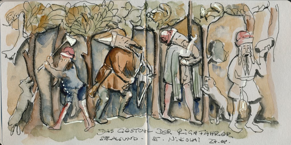 Ein ganz besonderes Zeugnis davon sind die hözernen Reliefs des „Gestühls der Rigafahrer“. In dieser Kaufmannsbruderschaft waren Kaufleute organsiert, die sich auf den Nordosthandel spezialisiert hatten – der von Stralsund vorwiegend über Riga abgewickelt wurde.