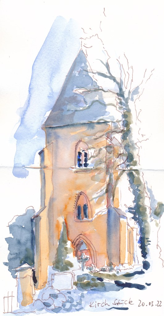 An der ersten Kirche bin ich schon ungezählte Male vorbei gefahren. Sie liegt wenige Kilometer nördlich von Schwerin direkt an der Straße nach Wismar auf einem Hügel, der weit ins Land blickt. Sie wirkt verloren dort, fast ohne Dorf an einer lebhaft befahrenen Fernverkehrsstraße; dabei ist sie groß und stattlich für eine Dorfkirche. Innen soll sie reich ausgestattet sein mit einem prächtigen Schnitzaltar und kostbaren mittelalterlichen Fenstern, doch ich hätte mir einen Schlüssel holen müssen, um hineinzukommen. Stattdessen setzte ich mich auf die gegenüberliegende Straßenseite in den kalten und windigen Schatten und schaffte gerade mal eine Umrisszeichnung. Die schaute ich zu Hause etwas unentschlossen an, bis ich mich heute doch dazu durchrang, sie mit einer reduzierten Palette ein bisschen zu kolorieren.