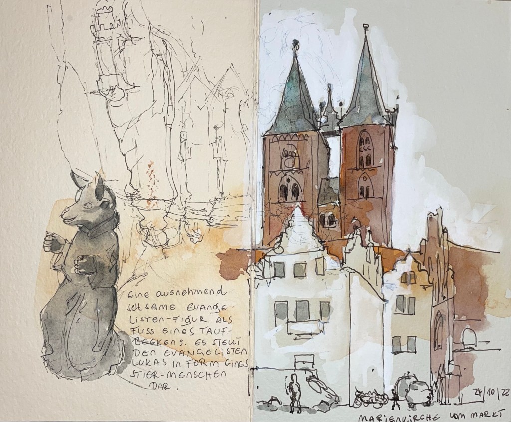 Veröffentlicht: 29. Oktober 2022 Abgelegt unter: Allgemein, Herbstreise 2022, Reiseskizzen, Urban Sketching | Tags: Altmark, Backstein, Backsteingotik, Dom, Gotik, Mittelalter, Pilgerweg Hinterlasse einen KommentarAuf dem Weg nach Tangermünde hatte ich ein paar Stunden in Stendal eingeplant. Es war Montag (also schon wieder ein paar Tage her), grau, kühl und windig. (Bald würde ich mich über Sonne von vorn beklagen …) Am Markt rüttelte ich vergeblich an der Tür der Marienkirche. Als ich mich schon zum Gehen wenden wollte, kam eine Küsterin und es gelang mir, mit hineinzuschlüpfen.