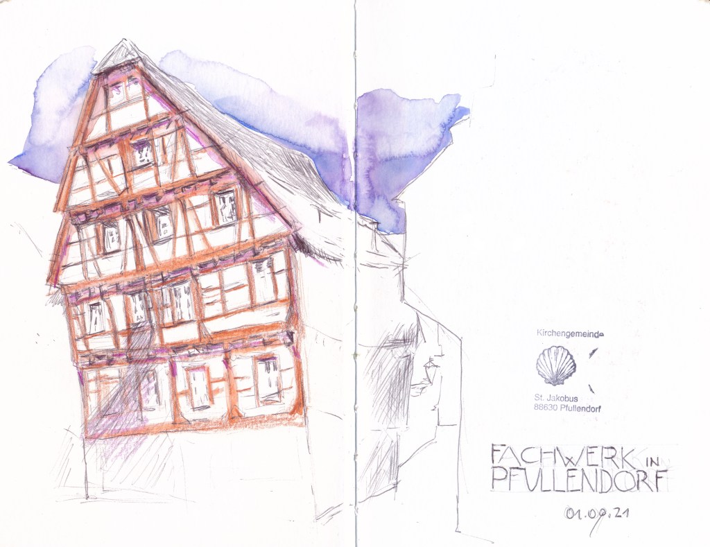 Veröffentlicht: 11. September 2021 Abgelegt unter: Allgemein, Bewohntes Gelände 10, Ink&Wash | Tags: Bodensee, Fachwerk, Pilgerweg Hinterlasse einen KommentarGestern und vorgestern waren anstrengende Gehtage, an denen ich wenig bis nicht gezeichnet habe. Eine Rast allerdings in dem ansonsten gesichtslosen Ort Amriswil konnte ich nicht ungenutzt vergehen lassen. Direkt gegenüber des schönen schattigen Bäckerimbisses sah ich das puppenstubenhaft restaurierte Alte Pfarrhaus. Für eine ausführliche Zeichnung hatte ich weder Zeit noch Ruhe. Was also war zu tun? Ich nahm mir den Füller mit dem dicksten Strich und fing an, geradewegs draufloszuklecksen, danach das gleiche noch mal mit der Farbe. Es ist kein Meisterwerk geworden, aber es erfüllt den Zweck einer Reiseskizze: es bewahrt Eindruck und Erinnerung in ganz anderer Weise als eine Fotografie.