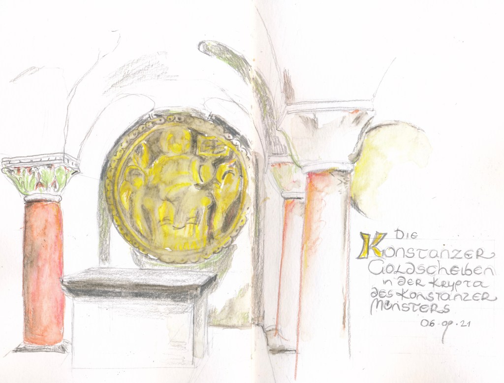 Veröffentlicht: 6. September 2021 Abgelegt unter: Allgemein, Bewohntes Gelände 10, Reiseskizzen | Tags: Bodensee, Pilgerweg, Romanik Hinterlasse einen KommentarDie sogenannten Konstanzer Goldscheiben sind vier teilweise vergoldete, kreisrunde Kupferplatten. Der Durchmesser der größten und ältesten beträgt fast zwei Meter. Vermutlich ist sie etwa tausend Jahre alt und wurde ursprünglich als Schlussstein einer symbolischen Nachbildung des Heiligen Grabes verwendet. Später brachte man sie außen am Münster an, ergänzt um die anderen drei.