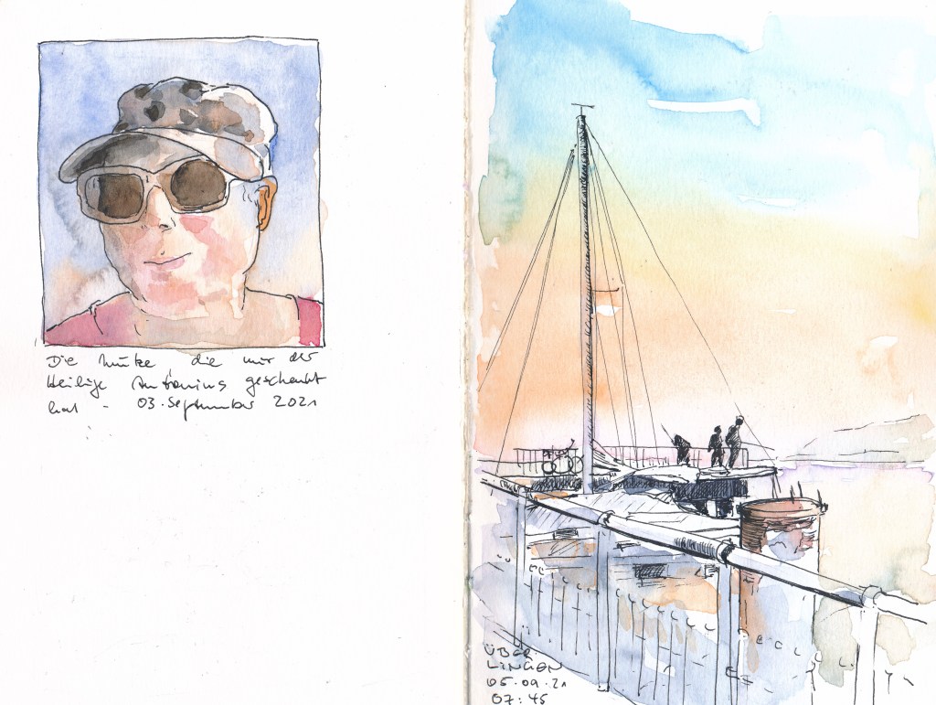 Veröffentlicht: 3. September 2021 Abgelegt unter: Allgemein, Bewohntes Gelände 10, Reiseskizzen, visuelles Tagebuch | Tags: Bodensee, Heiliger, Pilgerweg 3 KommentareIch liebe meinen Pilgerhut, und ich brauche ihn. Zu blöd, wenn ich ihn schon am Abend des erste Gehtages verliere! (Nicht zum ersten Mal, es war der dritte in sieben Jahren.) Heute morgen bastelte ich mir ein Provisorium aus einem Halstuch und lief in den sonnig strahlenden Tag hinein. Einen neuen oder wenigstens eine Mütze würde ich spätestens in zwei Tagen besorgen können, auf zwanzig Kilometer im Umkreis gibt es weder Bäcker noch Fleischer, geschweige denn einen Supermarkt.