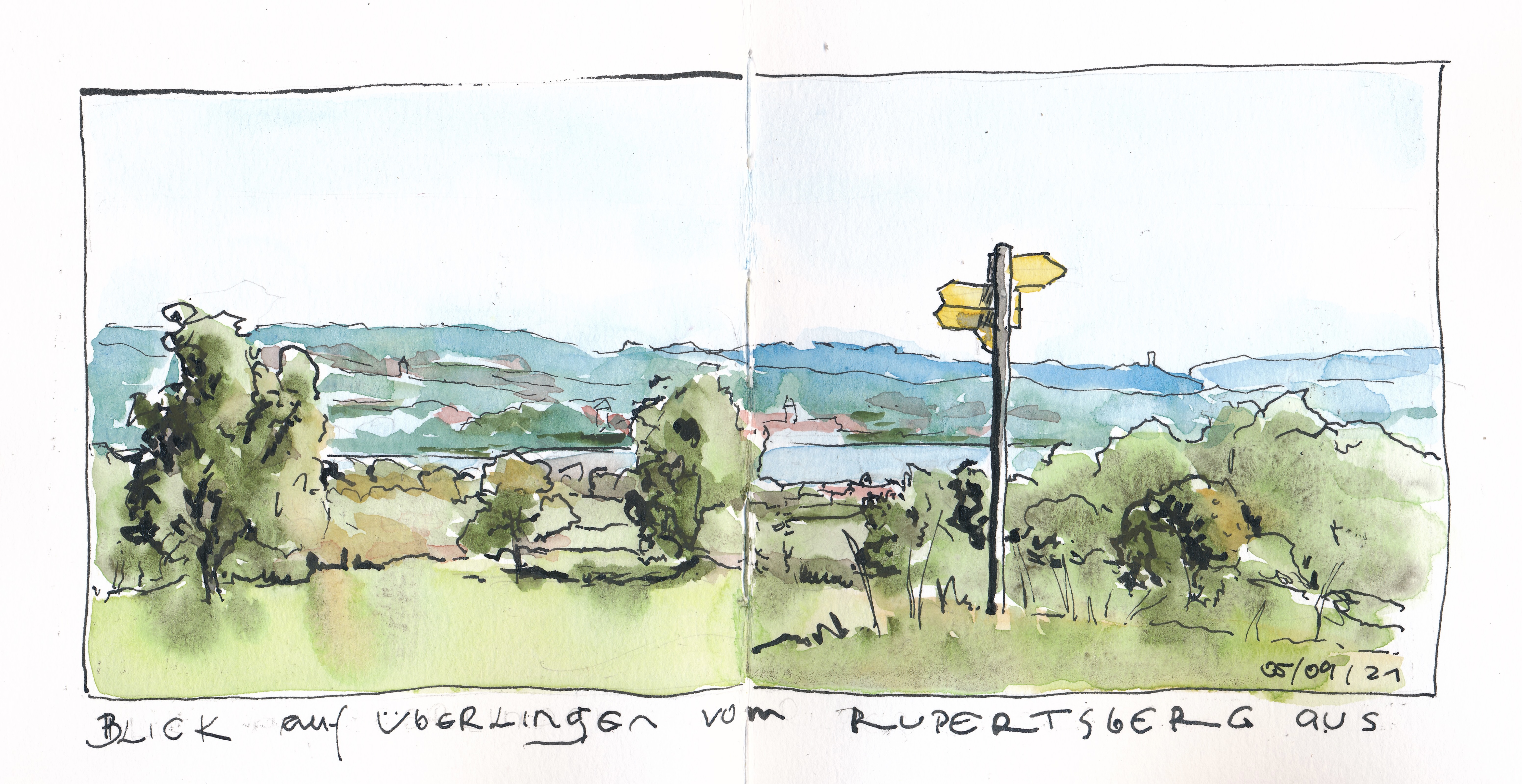Veröffentlicht: 17. November 2019 Abgelegt unter: Allgemein, Bewohntes Gelände 9, Bewohntes Gelönde, Reiseskizzen, Urban Sketching, visuelles Tagebuch | Tags: Bodensee, Café, Wallfahrtskirche Hinterlasse einen Kommentar… ist, anders als der Name vermuten lässt, kein Dorf, sondern eine Kleinstadt in Bodenseenähe. Mein letzter Wandertag hatte von Wald noch einmal durch den Wald geführt, der hier schon hügeliger wurde und nicht mehr so sumpfig war wie am Vortag. Als er sich sich nach einigen Kilometern unvermittelt öffnete, hatte es auch die Sonne durch den Nebel geschafft und die Stadt lag mit schöner Silhouette am gegenüberliegenden Hang.