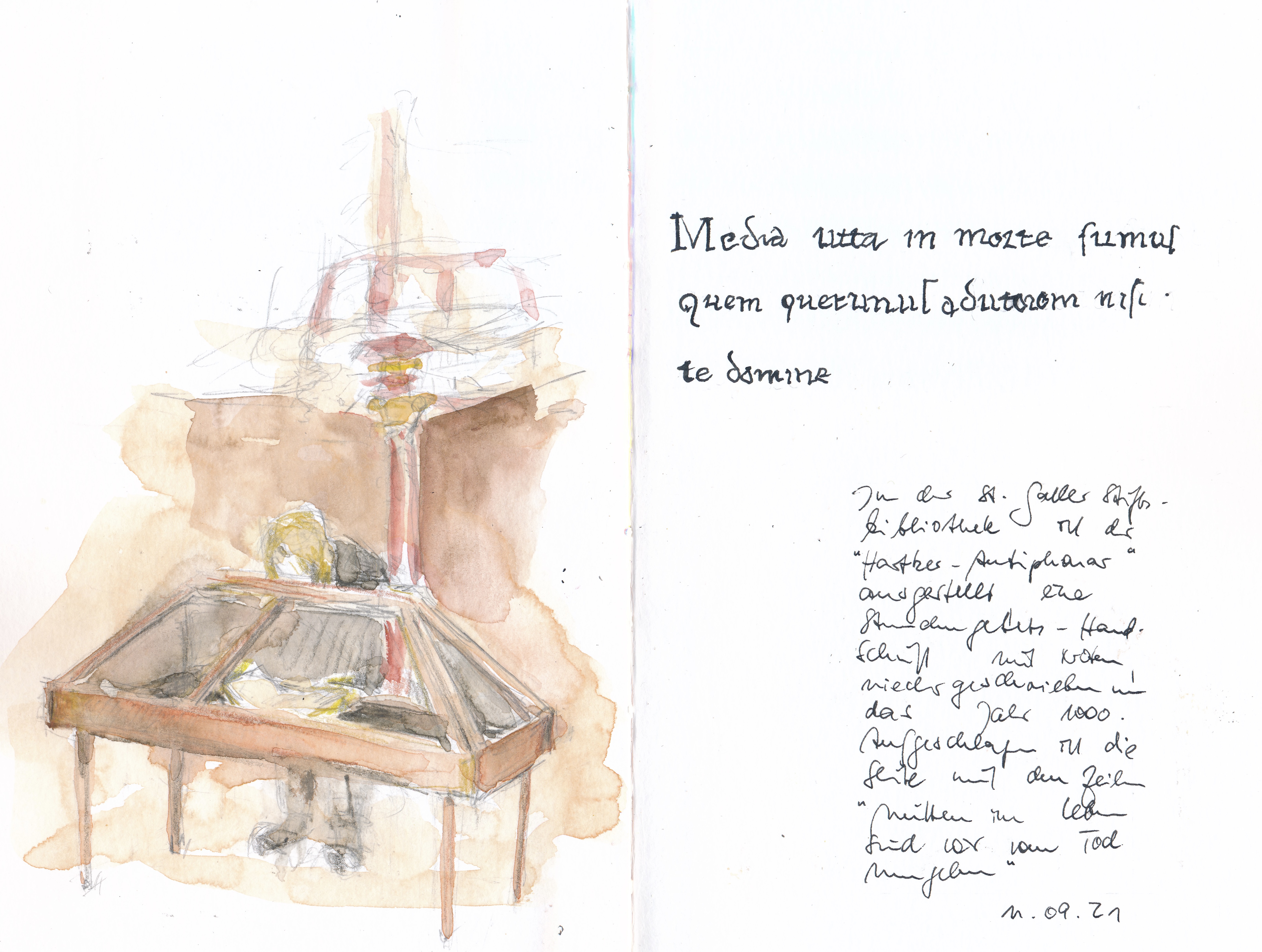 … und einige Tage später begegne ich dem Satz in einer 1000 Jahre alten Handschrift wieder, die in der St.Galler Stiftsbibliothekausgestellt wird.