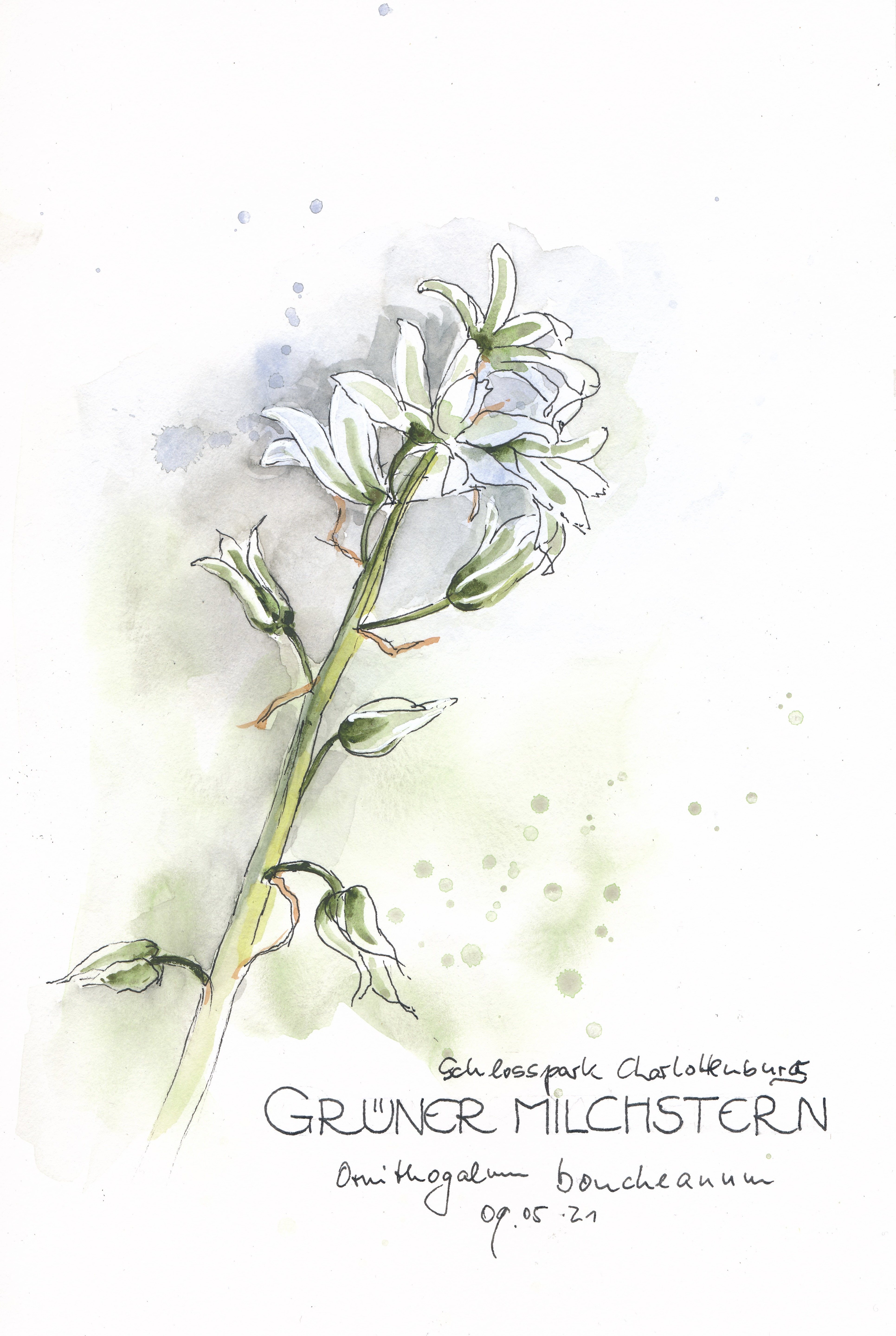 Namensgebend für den Stadtteil ist das ausgedehnte barocke Schloss mit seinem schönen Park, und dort gingen wir als erstes spazieren. Fasziniert betrachtete ich eine weißgrüne Zwiebelpflanze, die in großen Gruppen auf den Wiesen stand: einen Milchstern. Ich kannte bisher nur den Doldenblütigen, dessen Essenz als „Star of Bethlehem“ als Bachblüte Verwendung findet. Am liebsten hätte ich mich gleich auf der Wiese mit Skizzenbuch und Stift hingesetzt, doch ich nahm ein paar Stängel mit nach Hause und zeichnete einen am nächsten Morgen.