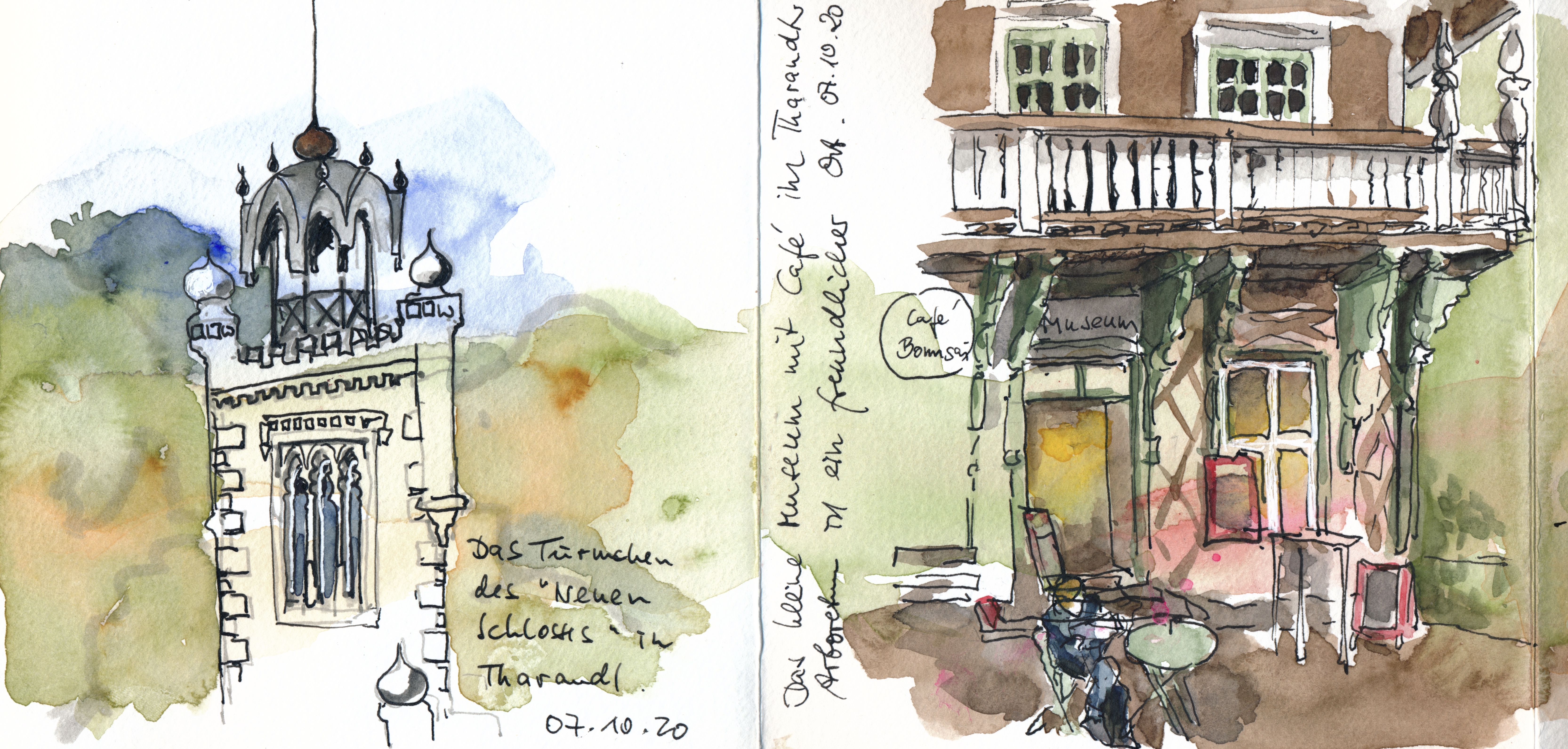 Am nächsten Tag gab es einen Ausflug in der Tharandter Wald. Hier, in einem ausgedehnten Waldgebiet am Rand des Erzgebirges, hat im 19.Jahrhundert die moderne Forstwirtschaft ihren Anfang genommen. Steigt man in Tharandt aus dem Zug, blickt man zu einer Burgruine hoch, die einem seltsam bekannt vorkommt: viele Maler des 19. Jahrhnderts haben sie gemalt. Oben angekommen, blickt man in ein Tal wie aus der Modelleisenbahn – und auf ein höchst seltsames Gebäude in einem bizarren, pseudo-orientalischen Stil. Es ist das „Neue Schloss“, dessen Türmchen neben der Burg dünn und seltsam flach in die Höhe ragt.