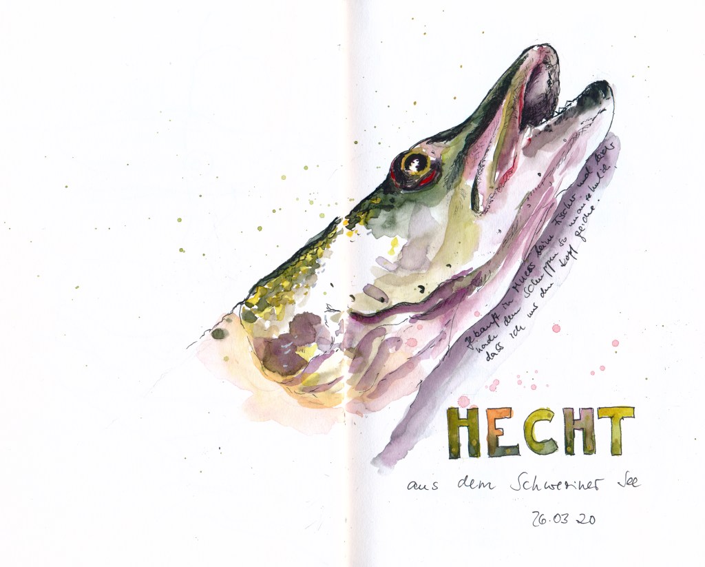 Diese Woche hatte ich mich für einen hecht entschieden, der dann leider ausgenommen und geschuppt nicht mehr schön aussah. So blieb es für die Zeichnung beim Kopf – dieses Mal wieder ganz konventionell mit Wasserfarbe.