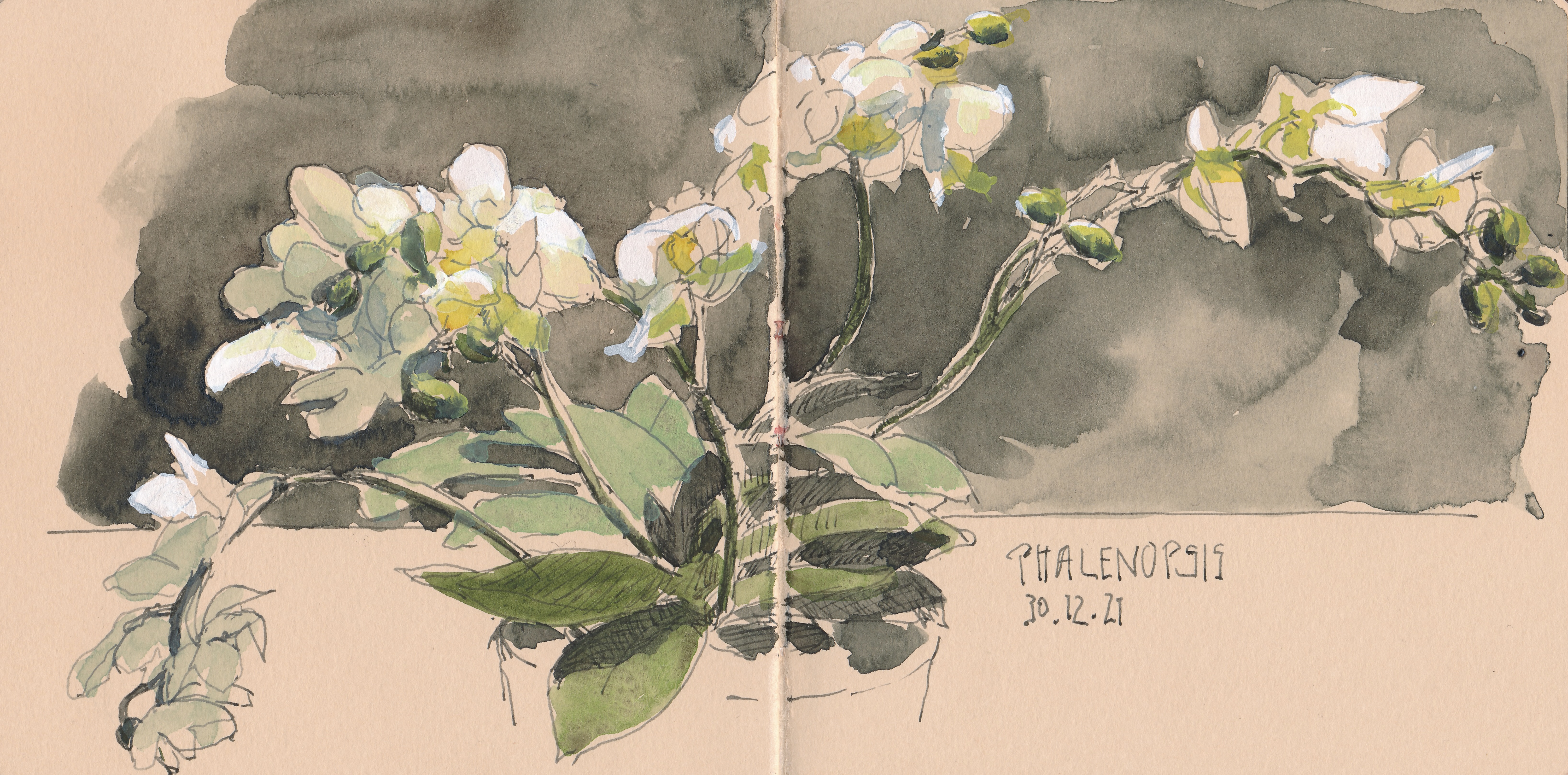 Die Bilder sind ein Kompromiss aus leidlich exakter Zeichnung und lockere Farbgebung. Gerne hätte ich mich in die Maserung jedes einzelnen Blättchens vertieft, hätte Farbreihen angelegt und mit jeder Pigmentschicht die Schönheit der Schöpfung gepriesen … Doch nicht nur, dass ich das gar nicht kann, jedenfalls nicht so gut wie die klassischen botanischen Illustratoren, – das Leben geht weiter, lockt mit immer wieder neuen Zeichenmotiven; es will nicht nur gezeichnet, sondern auch gelebt sein …
