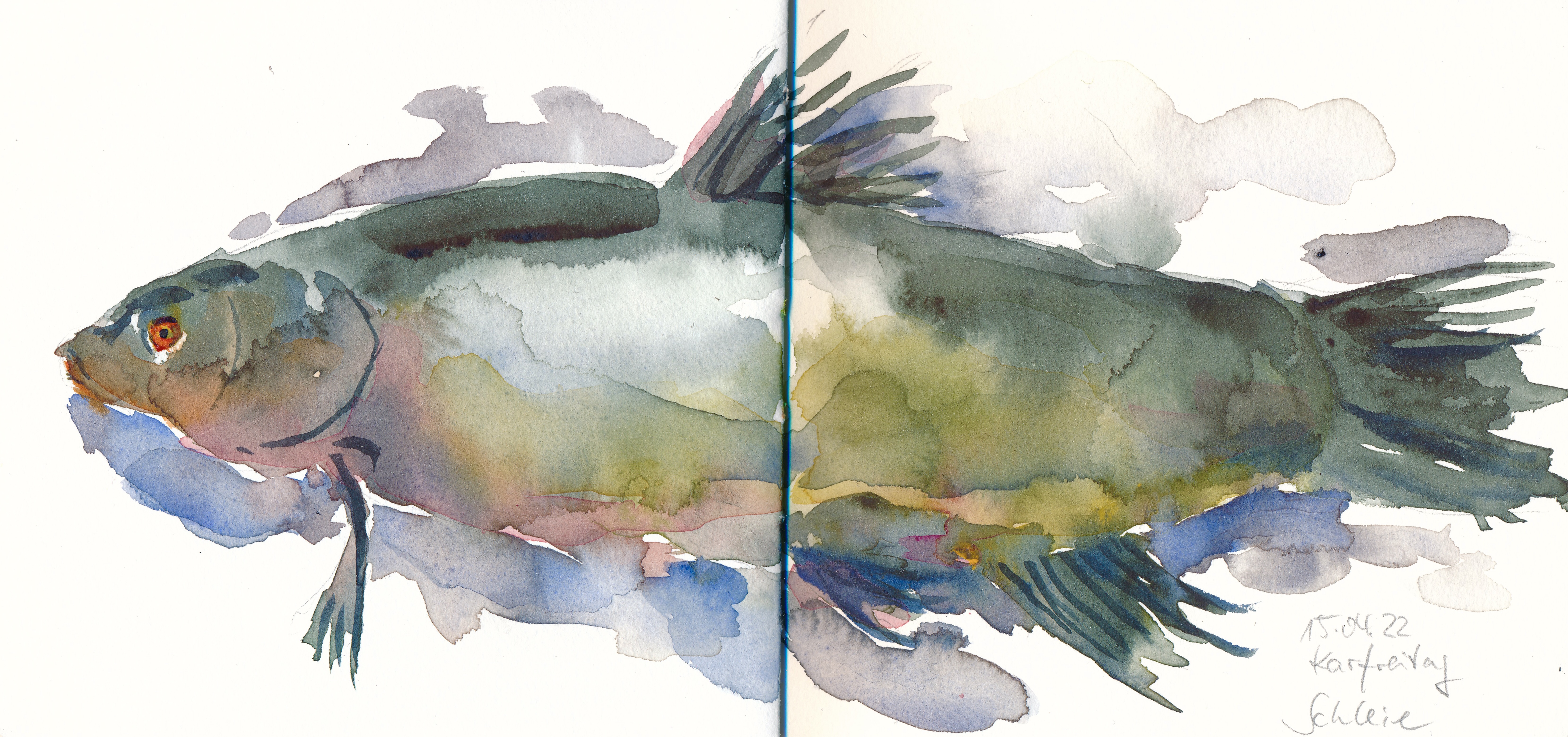 Veröffentlicht: 13. Juni 2022 Abgelegt unter: Allgemein, Botanische Malerei, Ink&Wash | Tags: Fisch, Frankreich, Kochen, Pflanzen Hinterlasse einen KommentarWir erinnern uns: Eine Wahrsagerin ist ermordet worden und wird von der Inhaberin eine Anglerpension gefunden, die ihr ein paar Schleie gebracht hatte. In dieser Pension wird der Kommissar später den Bösewichtern auf die Schliche kommen (wer nachlesen möchte, der Roman heißt „Maigret contra Picpus“), doch die Spur der Fische verliert sich im Ungewissen.