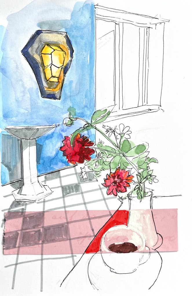 Veröffentlicht: 22. August 2018 Abgelegt unter: Allgemein, Alltag, Aquarell, visuelles Tagebuch | Tags: Alltag, DDR, Fisch, Museum, Obst, Schwerin, Sushi, Tee 2 KommentareTäglich zeichnen – was im Urlaub zu den Grundbedürfnissen gehört, will mit dem Alltag immer wieder neu ausdiskutiert werden, streitet sich mit Meditations- , Bewegungs- und Lesezeit um freie Plätze und Prioritäten ……..
