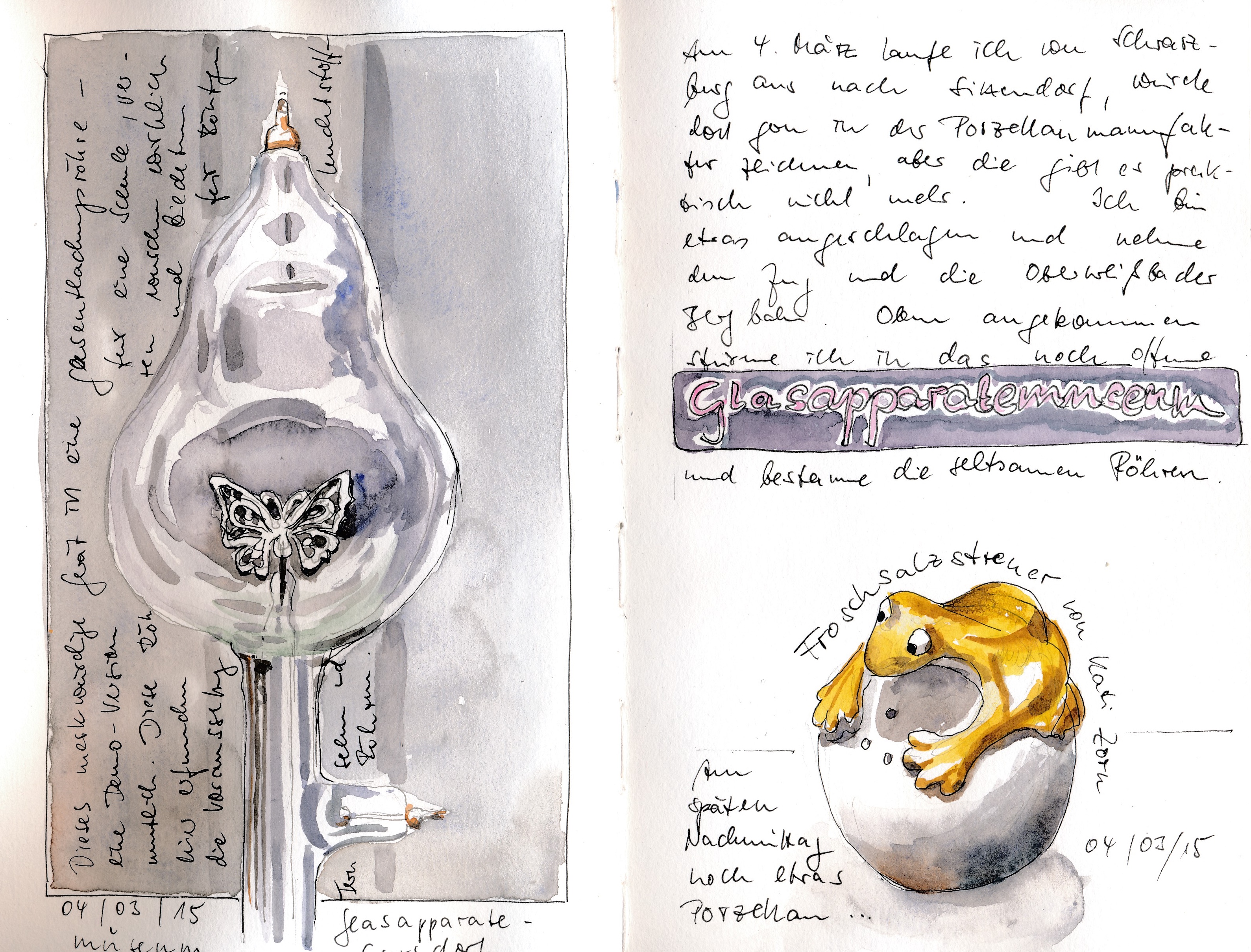Veröffentlicht: 28. März 2015 Abgelegt unter: Artist Journal, Bewohntes Gelände, Mixed Media, Urban Sketching | Tags: Glas, Thüringen, Weihnachten 2 KommentareDer Thüringer Wald ist Glasbläserland, und der uns allen vertraute Baumschmuck aus Glas wurde Mitte des 19.Jahrhunderts hier erfunden. Als ich Anfang März in Neuhaus war, lag dort noch Schnee, und ein Besuch im „Weihnachtsland“ der Glasmanufaktur Greiner erschien mir saisonal durchaus passend. Da sich im Zusammenhang mit Weihnachten die Kitschfrage nicht stellt (bzw. die Trennlinie anders verläuft als im restlichen Leben), konnte ich die von Kugeln, Zapfen, Glocken und Figuren überquellenden Regale von Herzen genießen. Schwierig wurde dann die Entscheidung, was am besten zu zeichnen wäre, am Ende habe ich mich für eine Schale mit Zapfen im klassischen Weihnachtsrot entschieden.