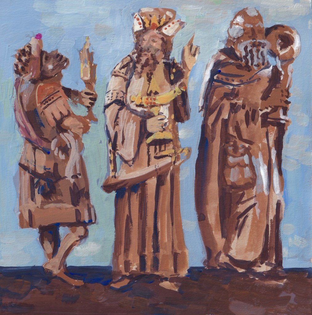 Häufig ging es auf diesen Bildern märchenhaft zu, mit Palmen, Kamelen und Schätzen, die drei Herren kostbar und exotisch gewandet. So eine Art Bild wollte ich zuerst malen, ein bisschen naiv, wie eine Illustration für ein Märchenbuch, ein Gegenentwurf zu meiner kämpferischen Interpretation von „Mariä Lichtmess“ im vergangenen Jahr. Ich schaute mich nach Vorbildern im Netz um und blieb bei drei spätmittelalterlichen Holzskulpturen hängen. Sie sind etwa dreiviertel lebensgroß, sehr fein und realistisch gearbeitet (man schaue sich nur die Hände an!); eine ursprüngliche farbige Bemalung hat man entfernt.