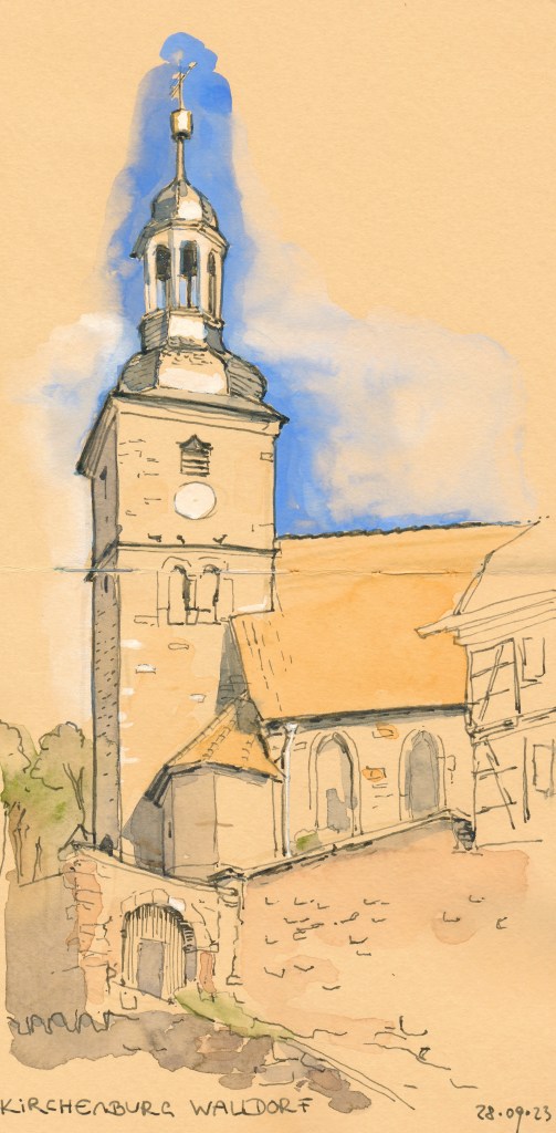 Es war ein schöner blauer Tag, herrliches Zeichenwetter, als ich vor zwei Wochen noch einmal mit Zeichenzeit nach Walldorf kam. Ich fing zwei Skizzen an, in unterschiedlichen Büchern – nur eine, diese, führte ich fort; die Farbe kam, wie so oft, zu Hause.