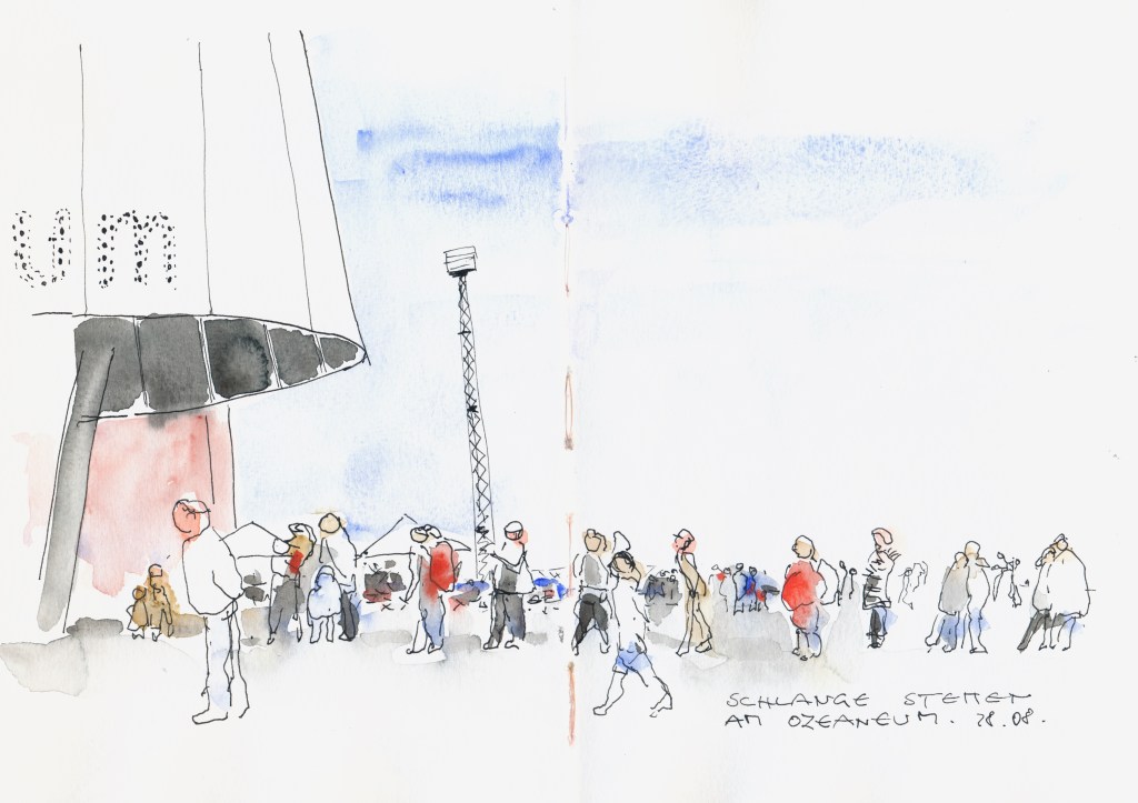 Veröffentlicht: 8. September 2020 Abgelegt unter: Reiseskizzen, Urban Sketching | Tags: Kloster, Stralsund, Vorpommern 2 KommentareAm Morgen regnete es nicht. Im Gegenteil: es schien sogar etwas Sonne. Ich hatte mir ein Frühstückscafé am Hafen ausgesucht; es erwies sich als beste Wahl mit gutem Essen und einem Logenblick auf die Warteschlange vor dem Ozeaneum.