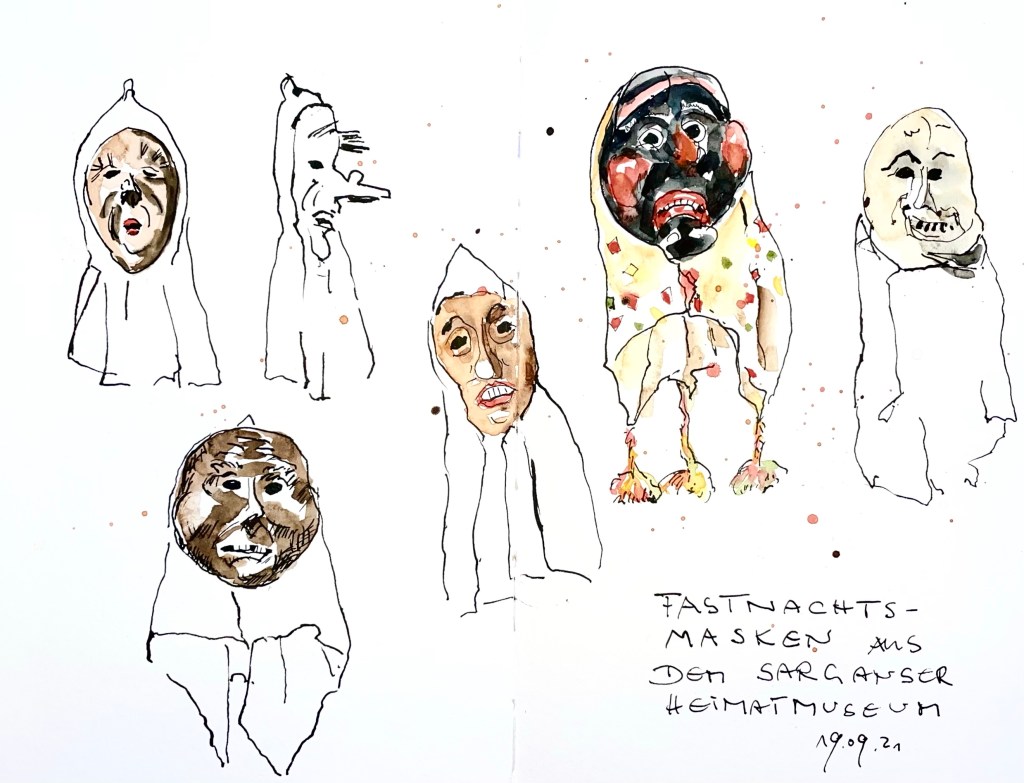 Am nächsten Tag goss es in Strömen! Was macht man bei solchem Wetter? Genau, man geht ins Museum. Fastnachtsmasken boten hier ein attraktives Zeichenmotiv, nach der Übung des Vortages gern ohne Vorzeichnung mit Füller zu Papier gebracht.