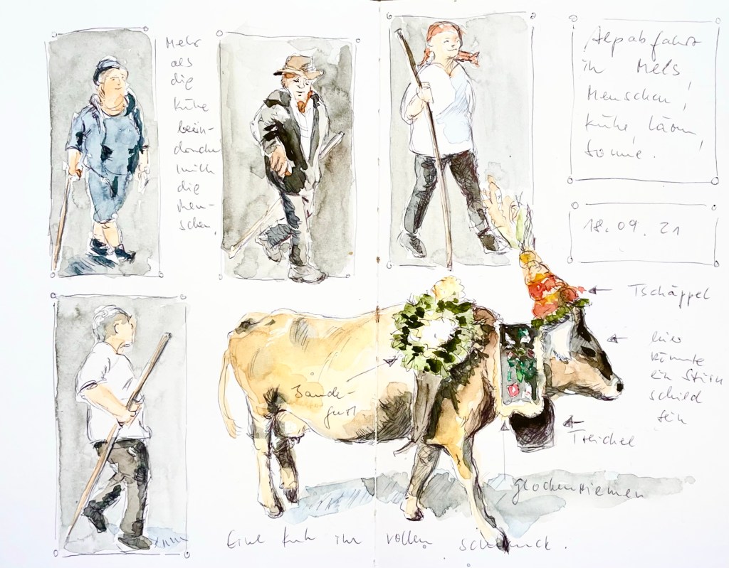Veröffentlicht: 21. September 2021 Abgelegt unter: Allgemein, Bewohntes Gelände 10, Reiseskizzen, visuelles Tagebuch | Tags: Folklore, Kühe, Schweiz, visuelles Tagebuch 2 KommentareLetzten Samstag wurde in Mels die Alpabfahrt gefeiert. Ich verkürzte meine Wanderstrecke und stellte mich bei strahlendem Wetter mit an den Straßenrand, um die ankommenden Kühe und Ziegen zu bestaunen. (Im Übrigen eine unter Coronabedingungen nicht unumstrittene Aktion, in anderen Orten wurde alles Rahmenprogramm abgesagt.)