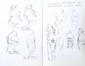 Dann hieß es für mich: gucken, staunen – und fotografieren. Denn an Zeichnen war in dem Trubel kaum zu denken, das habe ich auf die kleinen Rasten bei Bratwurst und Kaffee beschränkt. (Natürlich gab es an den langen Tischen auch reichlich Bier und Wein.)