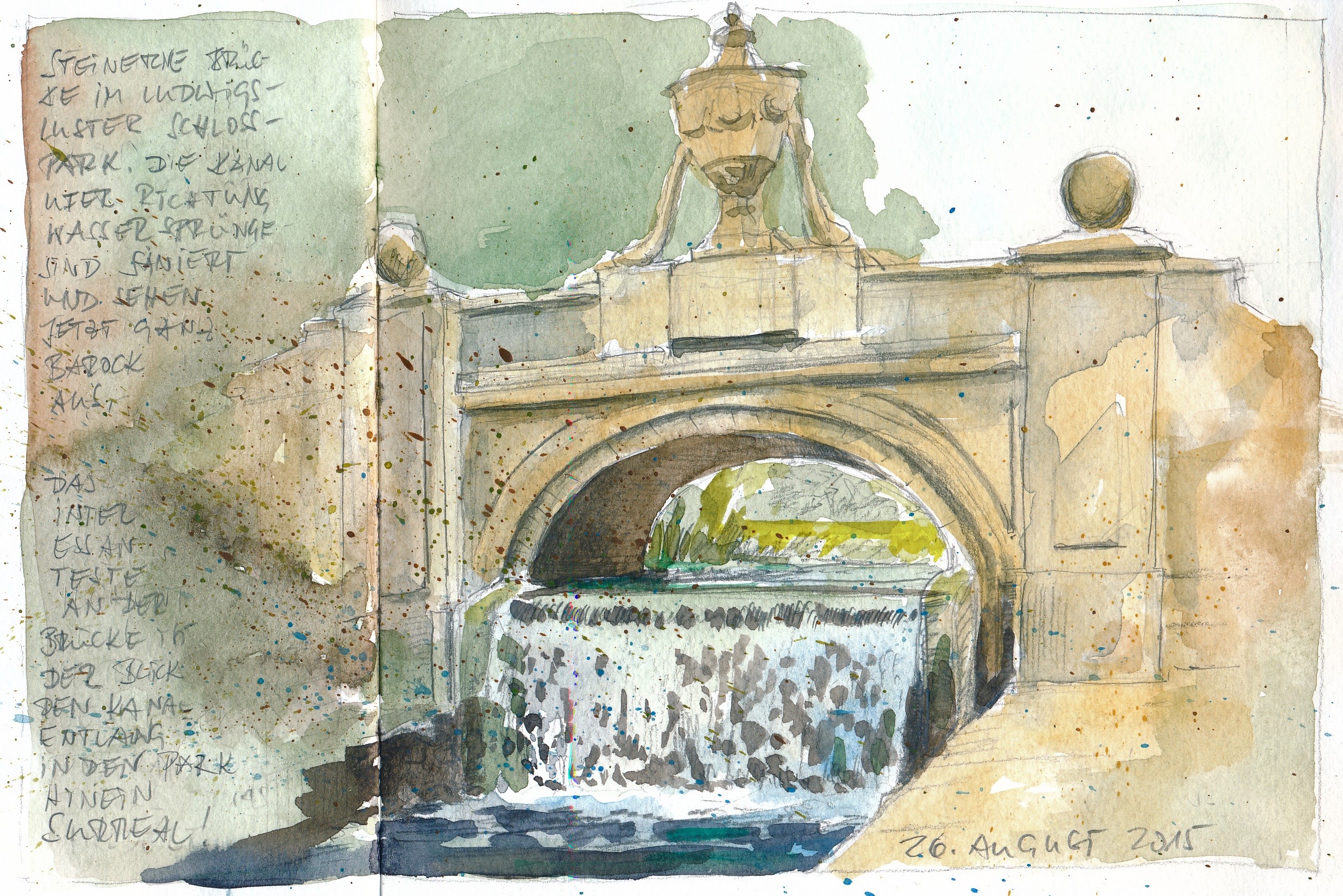 Die „steinerne Brücke“ im Ludwigsluster Schlosspark. Wasserfarbe über Bleistift in Kunst&Papier-Aquarellbuch