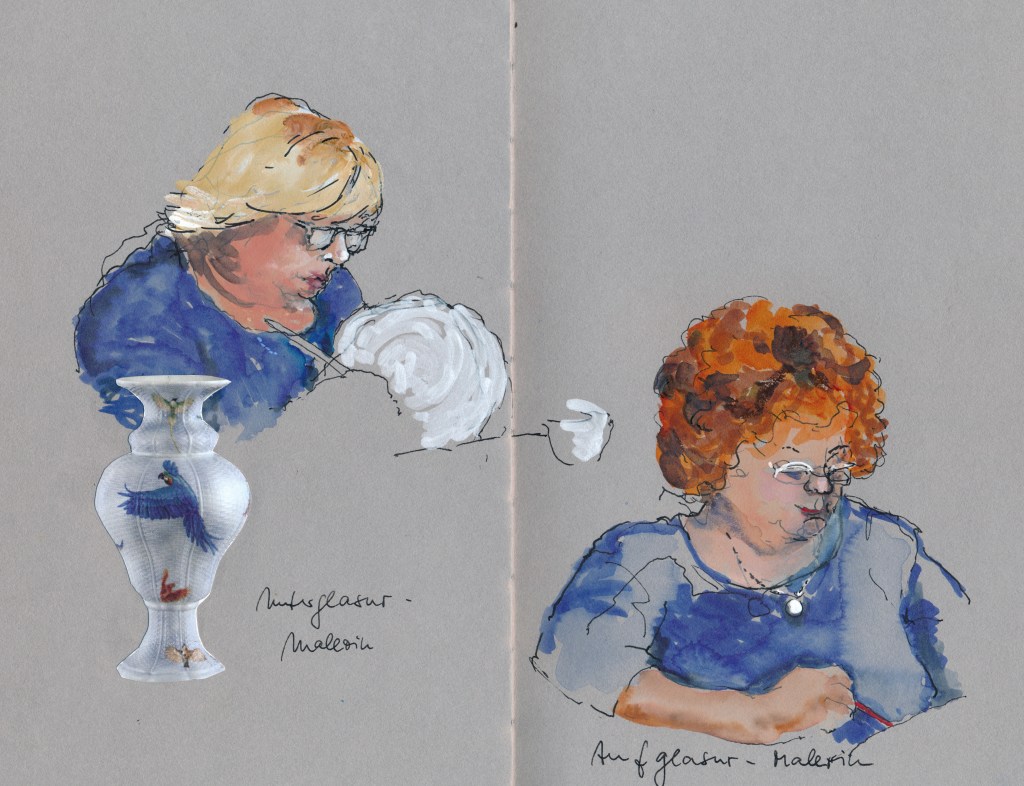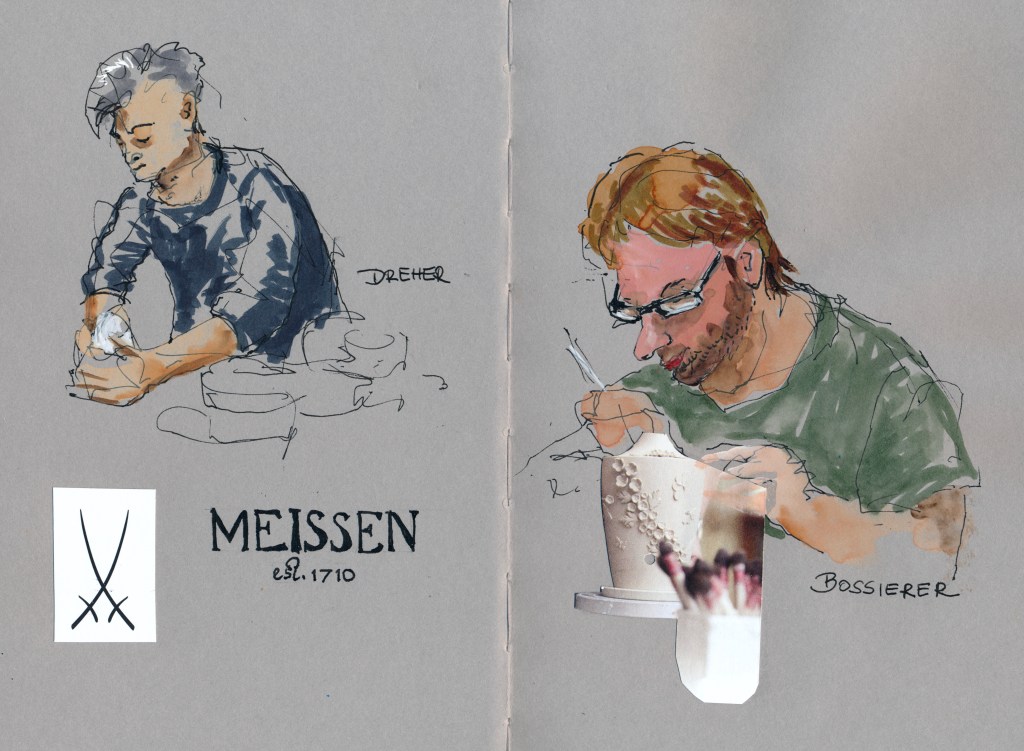 Veröffentlicht: 7. Dezember 2019 Abgelegt unter: Allgemein, Mixed Media, Reiseskizzen, Urban Sketching, visuelles Tagebuch | Tags: Meißen, Porzellan, Sachsen Hinterlasse einen KommentarVor einiger Zeit sah ich ein wunderbares Aquarell einer Meissner Porzellantasse, und da ich schon wusste, dass ich nach Dresden fahren würde, nahm ich mir vor, einen Abstecher in die Meissner Manufaktur zu machen. Als Achtjährige war ich dort schon einmal gewesen, auch damals konnte man den Porzellanmalerinnen schon auf die Finger sehen und ich erinnere mich daran, wie erstaunt ich darüber war, dass das ungebrannte Kobaltblau fast schwarz ist.