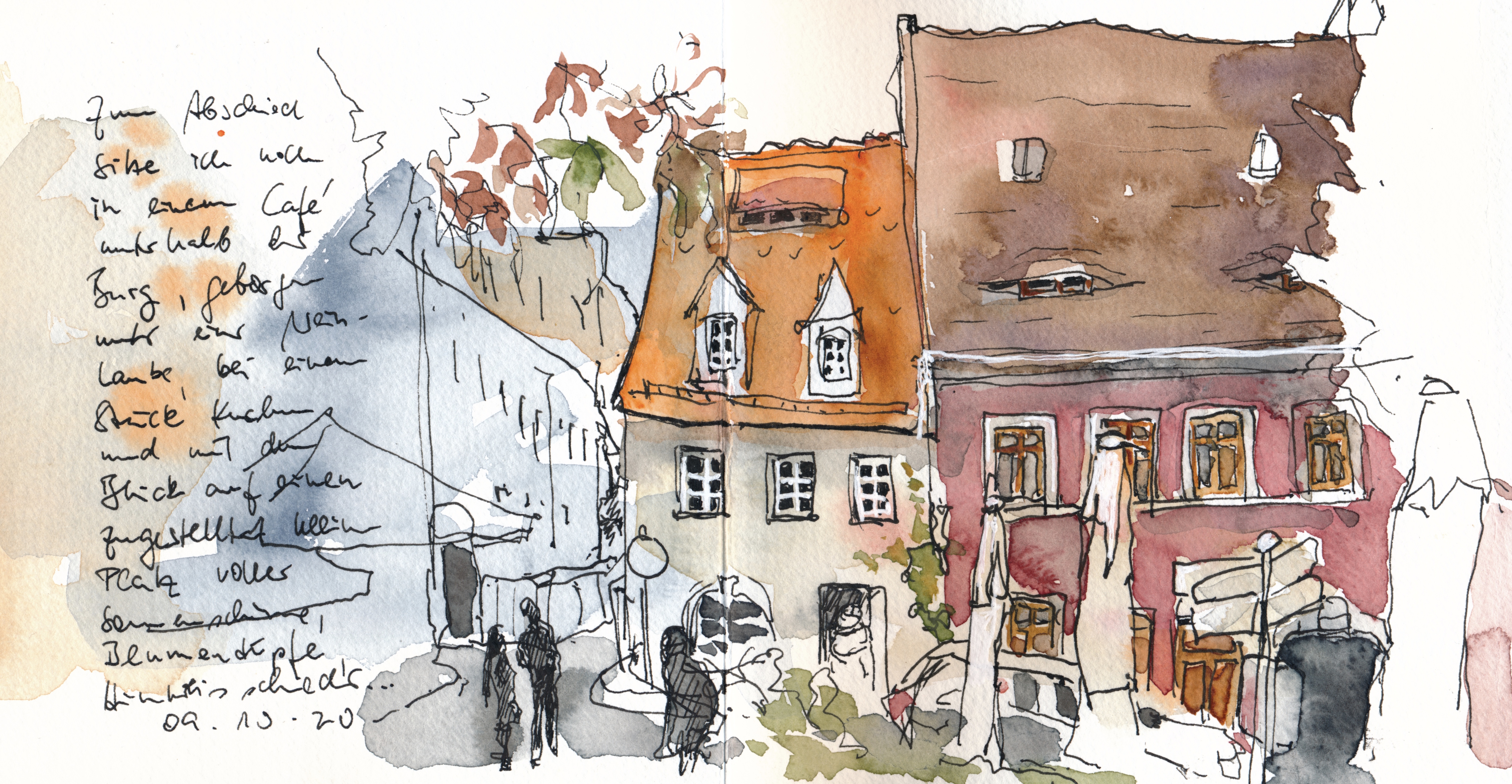 Veröffentlicht: 18. Oktober 2020 Abgelegt unter: Allgemein, Pen&Ink, Reiseskizzen, Urban Sketching, visuelles Tagebuch | Tags: Burg, Meißen, Sachsen 2 KommentareSo ein Leporello ist eigentlicher ein Papierstreifen – mit einer Vorder- und einer Rückseite. Die Vorderseite hatte sich auf einer Grundierung mit leuchtenden Herbstfarben über einige Tage gefüllt; blieb noch ein letzter Urlaubstag für die Rückseite. Das Wetter war grau und ein bisschen regnerisch, ich passte die Farbstellung daran an und fuhr nach Meißen, wo die Albrechtsburg notfalls Innenräume für ganze Zeichenwochen geboten hätte.