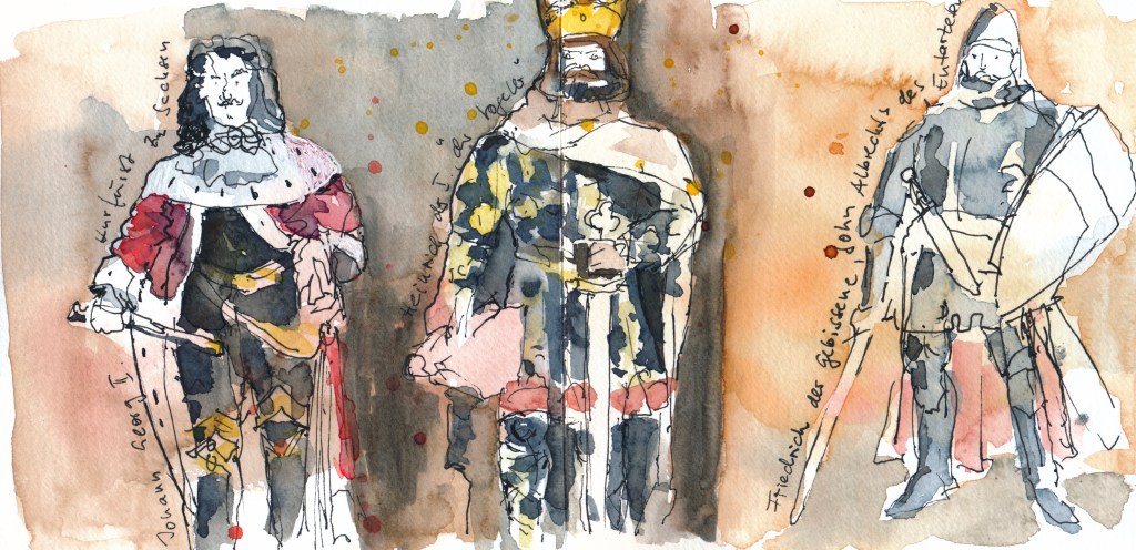 Die Repräsentationsräume im ersten Stock sind, ähnlich wie in der Eisenacher Wartburg mit überbordenden Wandmalereien und neogotischen Dekorationen geschmückt. Hier hatten es mir die mindestens lebensgroßen, bunt bemalten Herrscherfiguren angetan, die in einer Zeit entstanden sind, als breitbeinig zur Schau getragene und mit diversen phallischen Symbolen dekorierte Männlichkeit ein noch unbezweifeltes Ideal war. Den ganz rechten Herrn habe ich von einem Wandbild abgezeichnet: „Friedrich der Gebissene, Sohn Albrechts des Entarteten“ – der musste einfach mit! (Die Beinamen sind authentisch.)