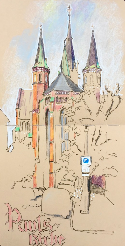 Veröffentlicht: 14. Juni 2020 Abgelegt unter: Architektur, Urban Sketching | Tags: Backstein, mixed media, Neugotik, Schwerin Hinterlasse einen KommentarDie Schweriner Paulskirche ist die dritte und jüngste der Schweriner Innenstadtkirchen, ein typisch neugotischer Bau, der vor allem durch seine Lage auf einem Hügel beeindruckt. Seine spitzen Märchentürme überragen die Wohn- und Geschäftsbauten der im 19.Jahrhundert entstandenen westlichen Stadterweiterung, die bahnhofsnahen Speicher und sogar die Bausünden der 1970er bis 90er Jahre.