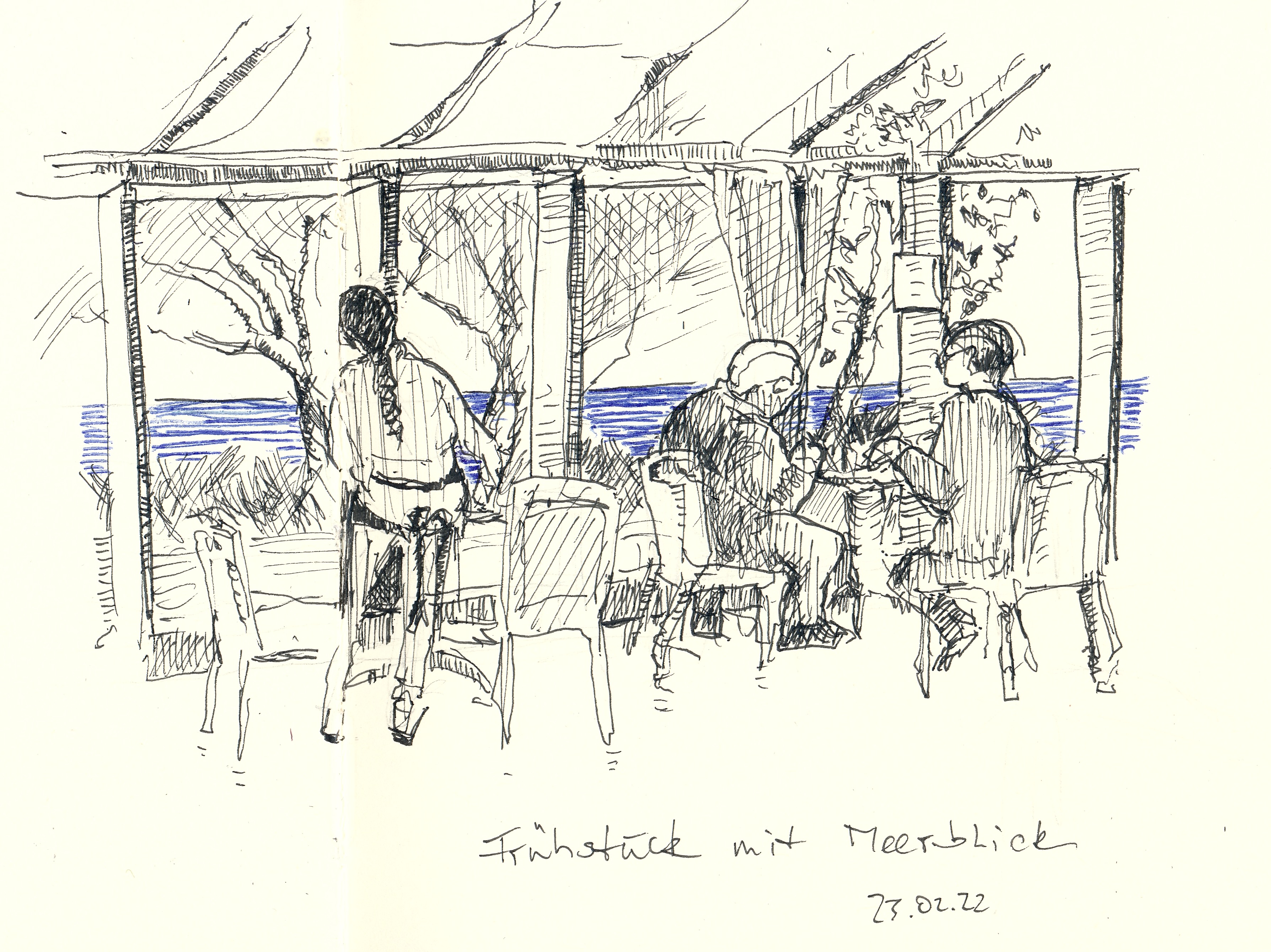 Beim Frühstück hatte ich mehr Glück: nicht nur, dass draußen blauer Himmel über blauem Meer auf mich wartete – die Leute hielten auch so lange still, bis ich sie halbwegs auf dem Bild hatte.