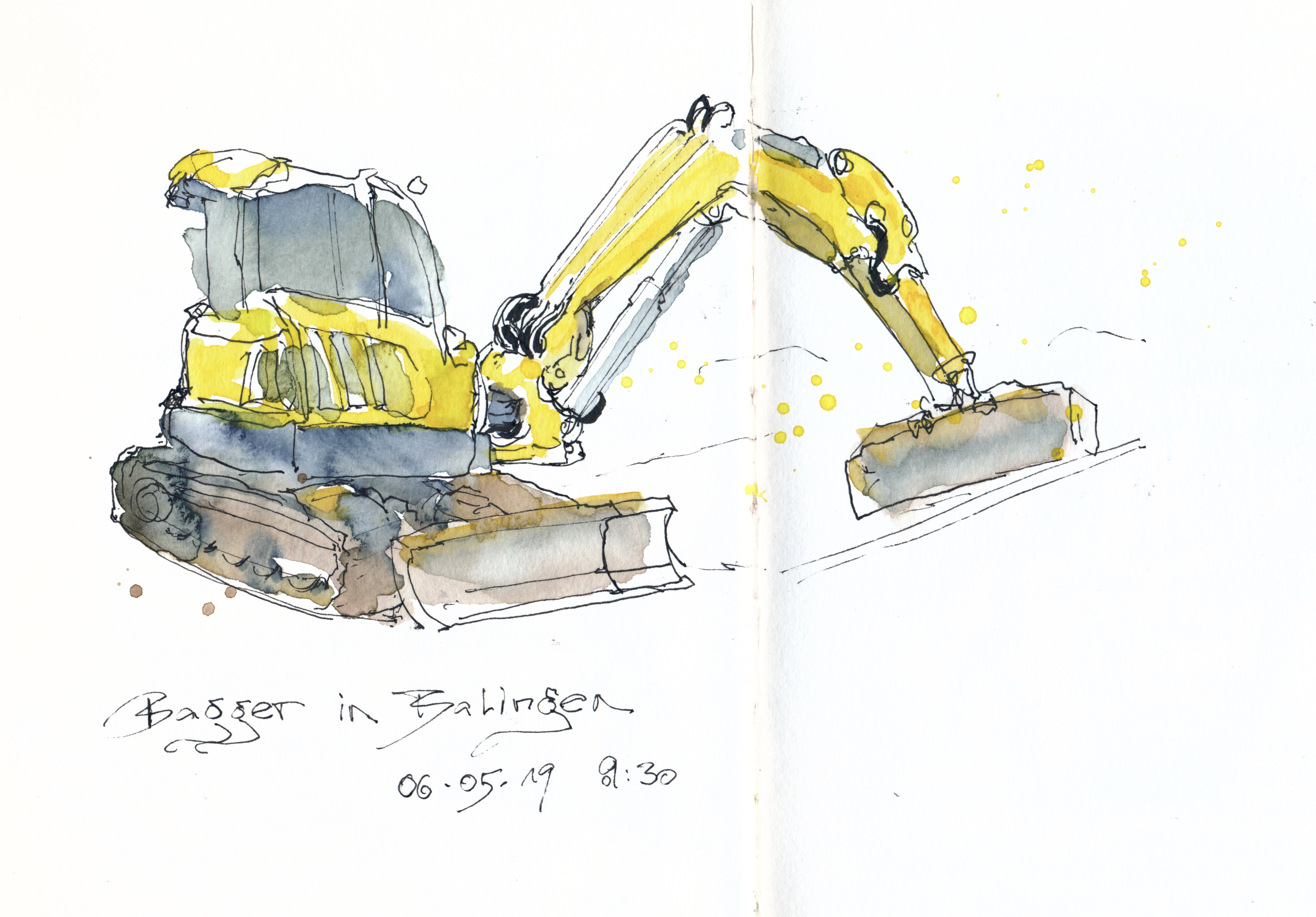 Einiges, wie die flüchtigen Skizzen der letzten, kurzen Wanderetappe von Bisingen nach Balingen bleibt unfertig und ungescannt zwischen den Buchdeckeln. Dafür leistete ich am Morgen beim Frühstück, schön im Warmen hinter einer großen Scheibe, meinen Beitrag zu einem derzeitigen running gag der Urban Sketcher: ich zeichnete einen Bagger. (Und hatte, da keine Wanderetappe anstand, Zeit für die Kolorierung.) Das kleine Bagger-Glück war ein schönes Beispiel für das, was Psychologen auf neudeutsch Reframing nennen: Dinge neu zu bewerten, in dem man sie in einem anderen Rahmen betrachtet – eine Baustelle vor dem Hotel gehört sonst ja eher nicht zu den Reisefreuden.