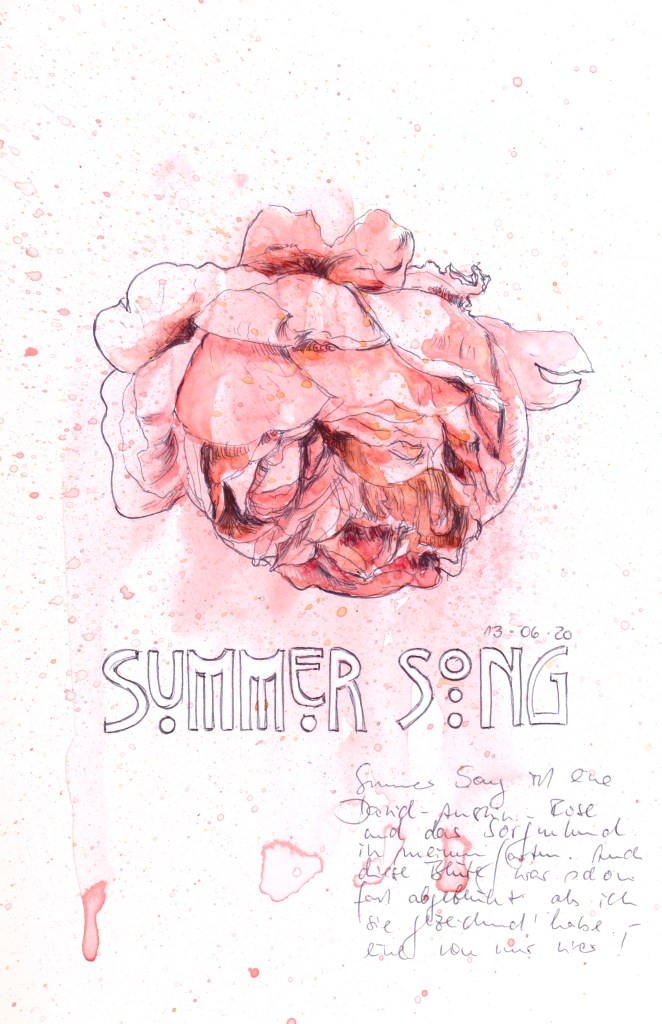 Weil dieses Jahr alles anders ist, könnte es vielleicht auch mit den Rosen klappen. Angefangen habe ich mit der, die sich am rarsten macht, einer Diva in seltenem Braunrot. Wenige schwere Blütenköpfe hängen an eher feinen Zweigen; dieses Jahr waren es vier oder fünf in der ersten Blüte. Als ich mir deren letzte zum Zeichnen schnitt, war sie schon ausgeblichen und sah fast so aus wie eine normale lachsfarbene Rose. (Apropos normal: Erst mit ein paar Jahren Abstand nach der Pflanzung sehe ich, wie sehr auch Rosen der Mode unterliegen. Die meisten in meinen Beeten sind das, was man als „Englische Rosen“ bezeichnet, moderne Erinnerungen an „Alte Rosen“, duftend, zartfarben und voll von Unmengen gefälteter Blütenblättchen, die Art von Rosen, die ich nach der Wende als erstes in den Gartenzeitschriften sah …)