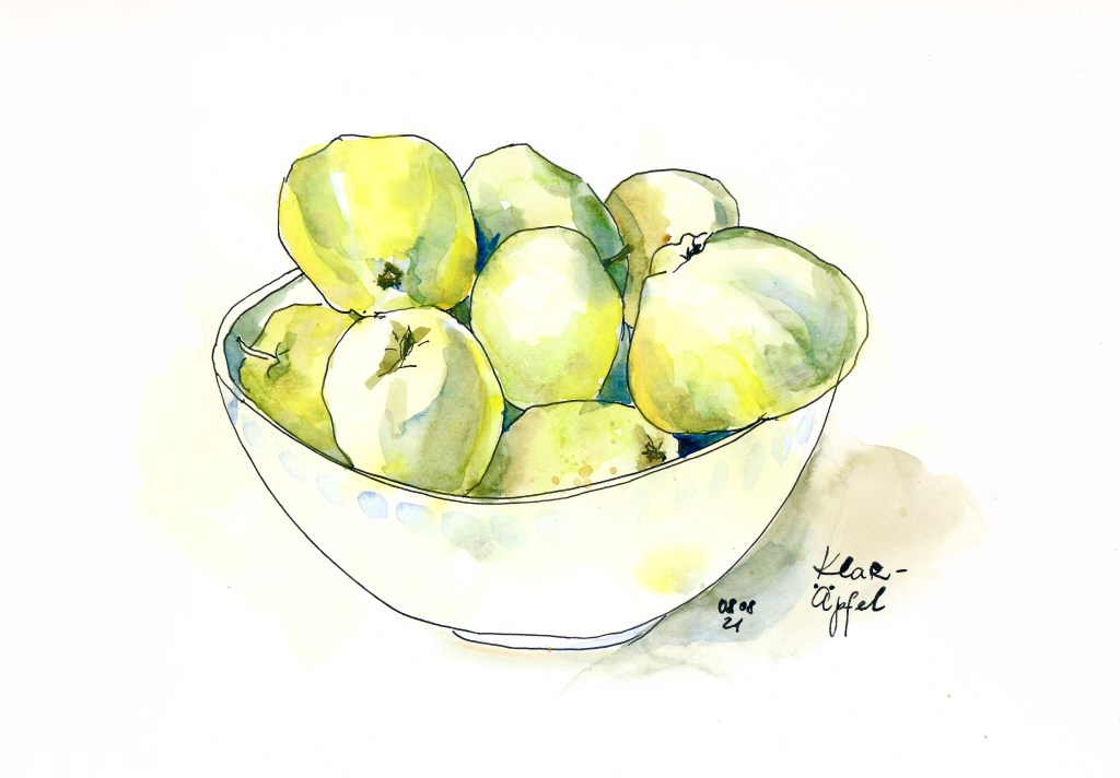 Veröffentlicht: 14. Juli 2024 Abgelegt unter: Alltag, visuelles Tagebuch | Tags: Bollhagen, Gouache, Obst, Stillleben 4 KommentareFrüher hießen sie Augustäpfel, dieses Jahr fielen die ersten – noch winzig, doch schon genießbar – Ende Juni vom Baum. Seit einer Woche gehe ich jeden Tag in den Garten und lese ein paar Hände voll auf, von Tag zu Tag werden sie größer und strahlen im schönsten Apfelgrün.
