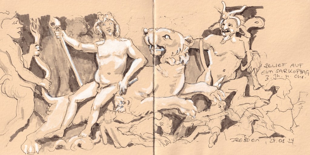 Das letzte Bild war am 55. von 100 Tagen entstanden, und dem Museumsplan kam etwas sehr Schönes in die Quere: es wurde Frühling. Ich saß am Ostersonntag vor der „Ewigkeitspforte“ der Schelfkirche, ich verbrachte stille Tage in Bellin und zeichnete, nicht zum ersten Mal, das Schweriner Schloss… Immer wieder, auch das sei hier erwähnt, kam es zu „ungezeichneten“ Tagen, aus Gründen …
