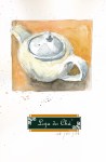 Nun, diese Tasse ging erst einmal daneben. Sie war schon gelungen, doch kein bisschen Liz, obwohl ich exakt nach ihrer Anleitung gezeichnet hatte. Allerdings nicht während des Teetrinkens, sondern über anderthalb Zugfahrten verteilt – die Woche hatte es in sich und nur die allererste Vorzeichnung war am heimischen Frühstückstisch entstanden. „Exakt“ war hier jedoch das, was hier exakt nicht gefragt war: Liz‘ Bilder leben vom Tempo, von der Frische. Und da ich keine Lust auf die gleiche Tasse noch mal hatte, war beim nächsten Mal meine neue kleine Teekanne dran. Flott, mit einer bisschen unrunden Ellipse: bloß nicht zu perfekt. Das erstaunliche war: es fiel mir gar nicht schwer. (Ich kann beim Zeichnen von Stillleben sonst ganz schön haftend und perfektionistisch sein.) Eine Erfahrung, bei der mir, im übertragenen Sinne, fast ein bisschen schwindlig wurde – Identität ist eine „Sache“, von der wir uns anscheinend ungern trennen.