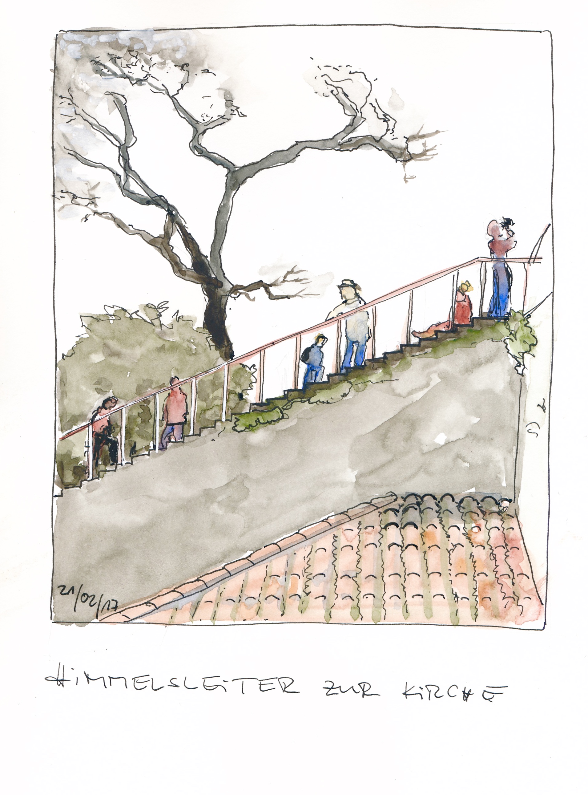 Zuerst eine Skizze von der Aussichtskanzel des Cap Girao. Einige Tage, bevor ich es aus der Ferne gezeichnet hatte, war ich entlang einer Levada hingewandert – eine schöne Tour, die allerdings leider ohne bildliche Ausbeute blieb. Erst am Ziel genoss ich das Vergnügen, menschliches Verhalten auf einer Glasplatte in 500m Höhe zu studieren. Die Selfie-KnipserInnen waren für meinen Stift allerdings zu schnell.