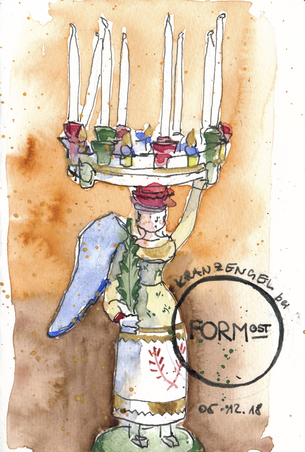 Weihnachtsmärkte sind eher nicht mein Ding, doch nach dessen Durchquerung freute ich mich heute Nachmittag besonders auf das Schaufenster von „Formost“ in der Schweriner Puschkinstraße, einem wunderbaren Geschäft mit dem Schwerpunkt „Designklassiker mit ostdeutschen Wurzeln“. Diese Engel sind Unikate oder Kleinstserien aus dem Erzgebirge; jedes Jahr stehe ich mit großen Kinderaugen davor und heute habe ich es endlich geschafft, einen zu zeichnen.