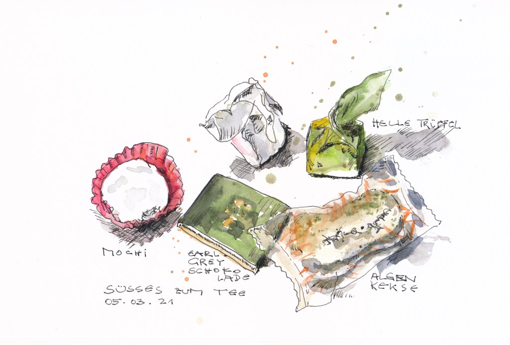 Veröffentlicht: 6. März 2021 Abgelegt unter: Alltag, Ink&Wash, visuelles Tagebuch | Tags: Alltag, Japan, Schwerin, Tee Hinterlasse einen KommentarGestern war mal wieder Gelegenheit, über den Freitagsmarkt zu schlendern und in die angrenzenden Geschäfte zu schauen. Lange war ich nicht mehr in der Rösterei Fuchs gewesen; natürlich nahm ich neben dem Kaffee noch die eine oder andere Kleinigkeit mit. Und dann der neue Asia-Laden! Da heißt es, sich mit Augenmaß durchzuknuspern. Mochi zum Grüntee, die gab es schone ein ganze Zeit nicht mehr. Und da es draußen zwar sonnig, aber eisig kalt war, zeichnete ich mit gutem Gewissen eine Auswahl der netten Kleinigkeiten.
