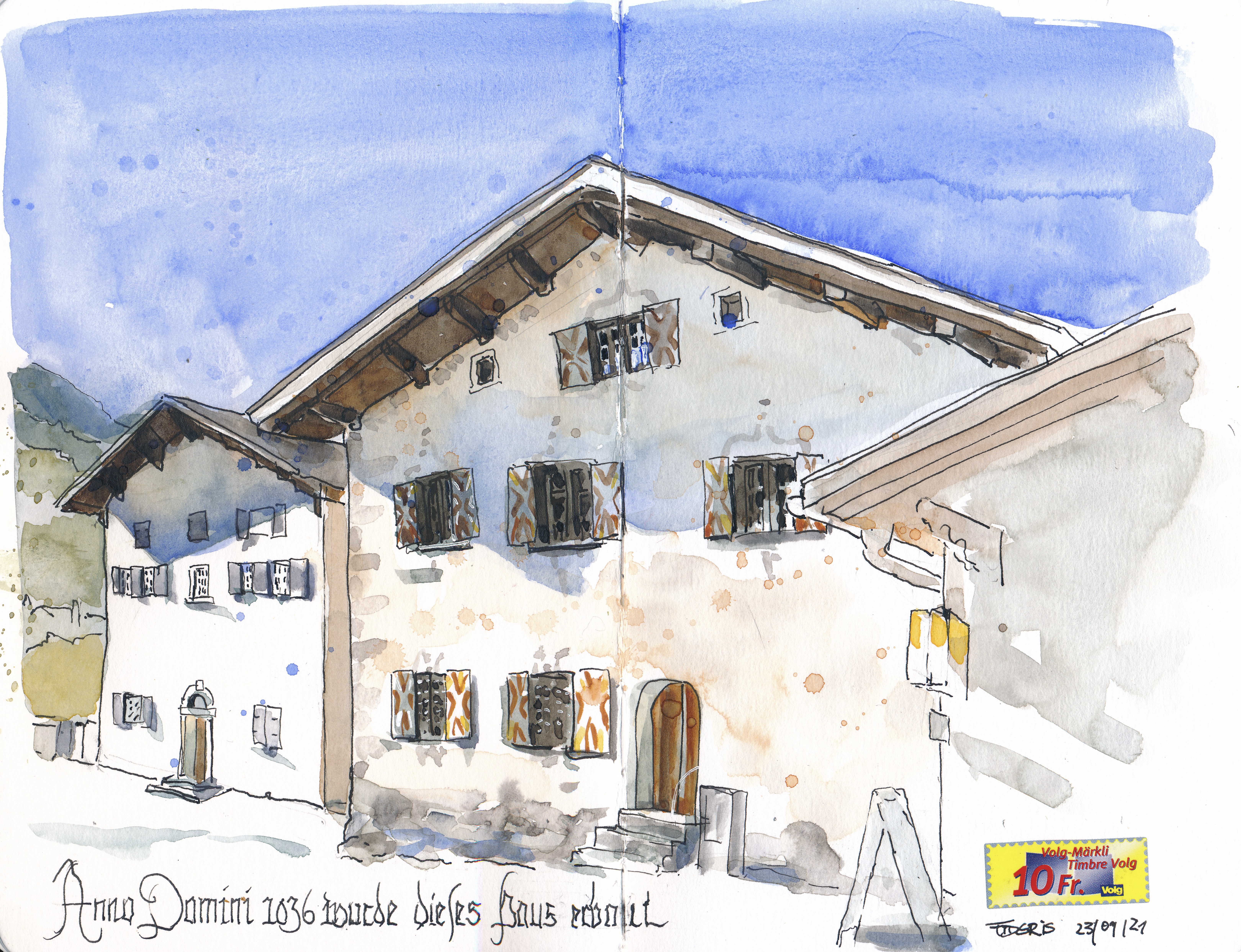 Das Dorf Fideris war im Dreißigjährigen Krieg – in den sogenannten „Bündner Wirren“ – unzerstört geblieben, so dass diese Häuser im Kern knapp tausend Jahre alt sind. Vorn rechts angedeutet habe ich den „Volg“, den Dorfkonsum, ein beneidenswertes Stück Schweizer Infrastruktur, das mir die Reise immer mal wieder erleichtert hat. (Und in dem es, wie man sieht, sogar Konsummarken gibt.)