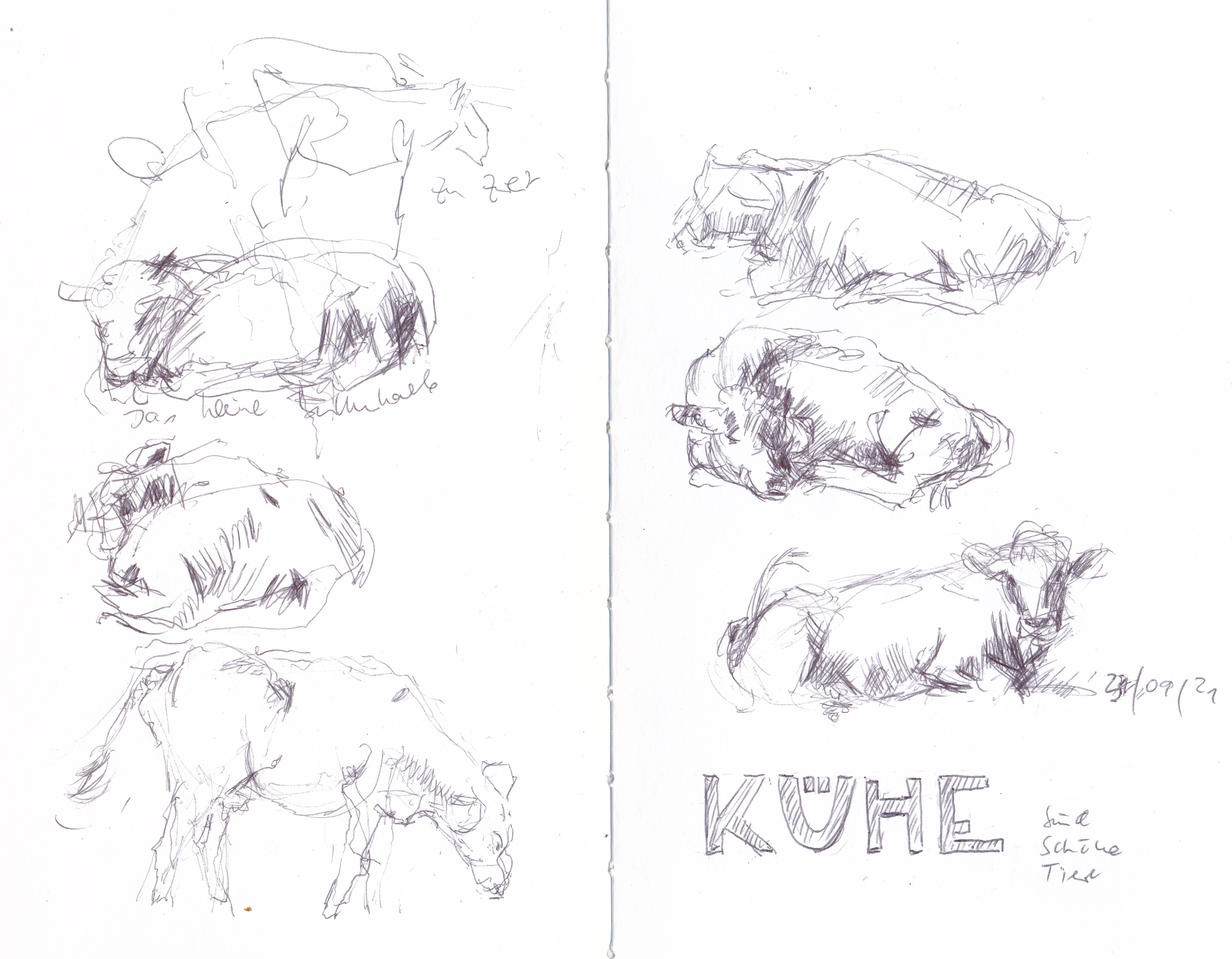 Ich hatte an diesem Tag – hach, endlich! – viel Zeichenzeit, da die Gehstrecke kurz war. Ich beließ es dennoch bei der linearen Verzeichnung und widmete mich erst einmal eine Stunde den Kühen auf der Weide.