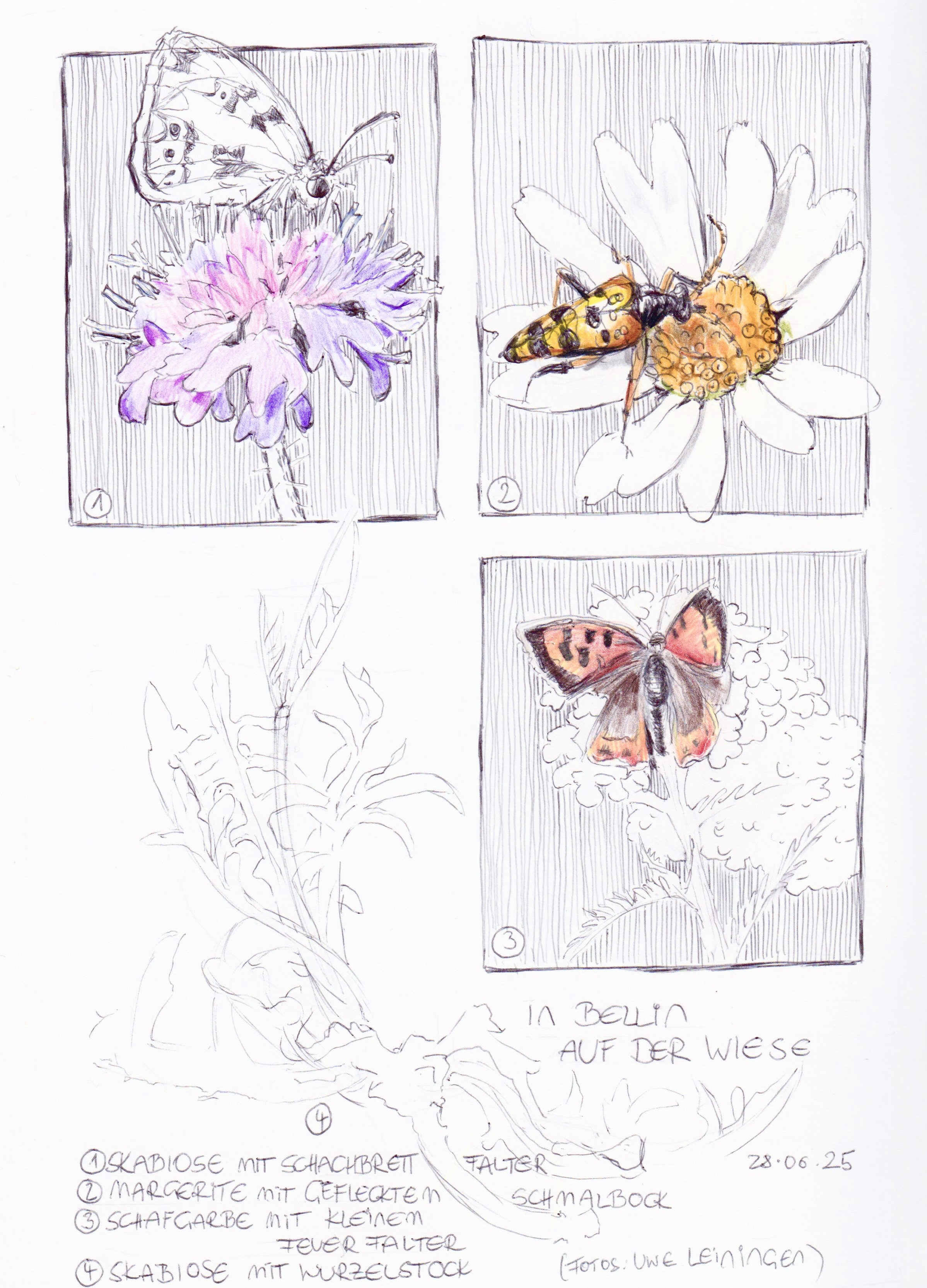 Es war Naturstudien-Wochenende; auf der Suche nach Zeichenmotiven zogen uns vor allem die Insekten in ihren Bann. (Vielleicht, weil sie anderswo so schmerzlich selten geworden sind …) Mein Mitzeichner stellte mir freundlicherweise seine Fotos zur Verfügung; so konnte ich mich einen Samstag lang auch zeichnend ganz den Insekten widmen.
